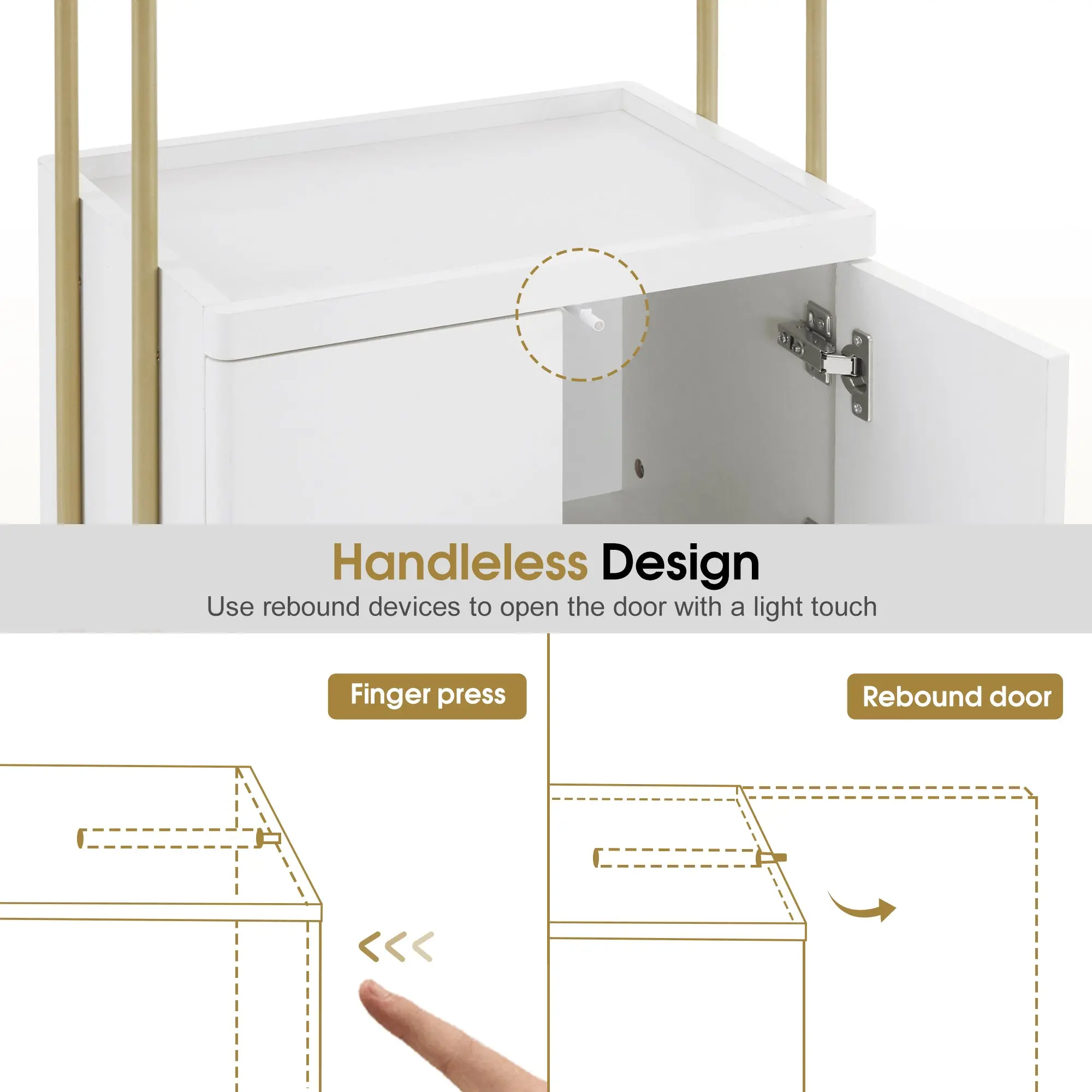 [Handleless Design]: The cabinet is designed with rebound devices, it is very convenient to open the door with a light touch, and look simple and aesthetic without handles.