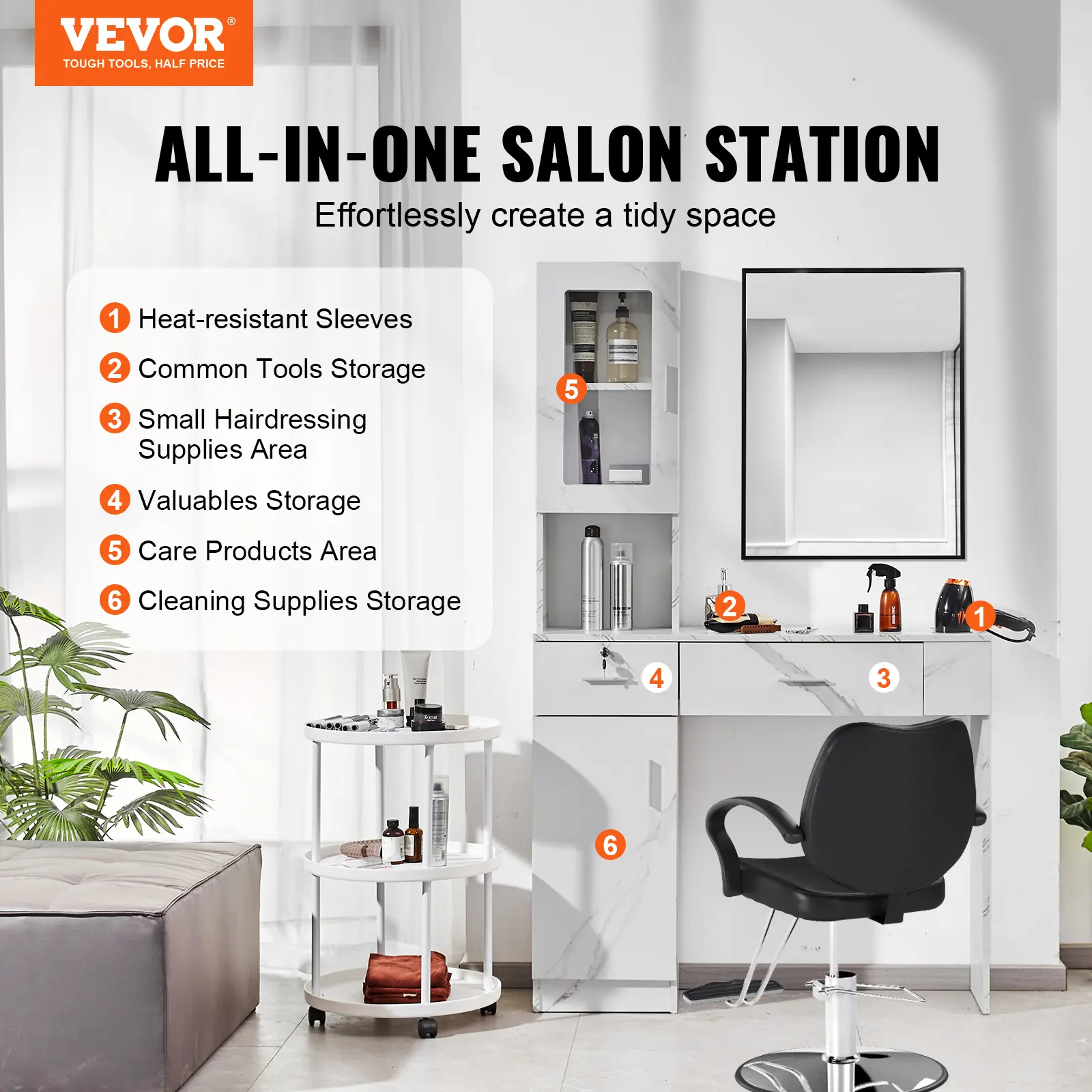• Versatile Storage: Tailored for hairdressing tools, this salon station features smooth drawers and compartments to neatly organize items like hairdryers, curling irons, razors, and electric clippers. The bottom cabinet provides ample space for larger items, offering a crucial storage solution for efficient and tidy hairstylists.