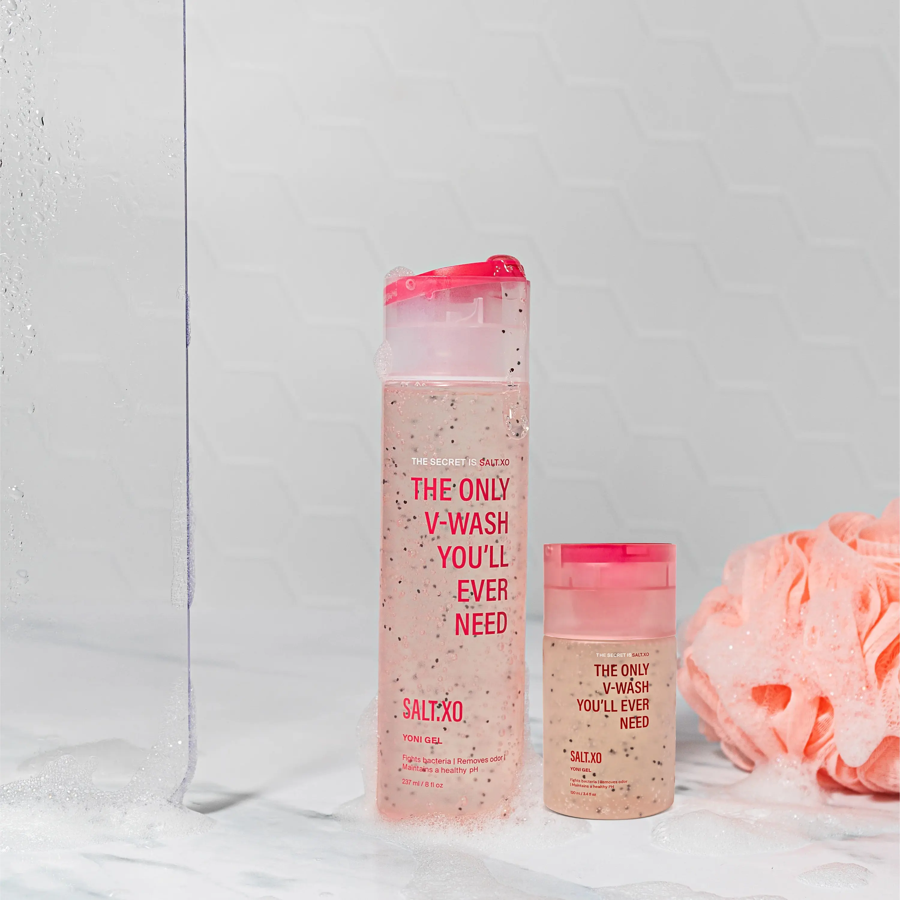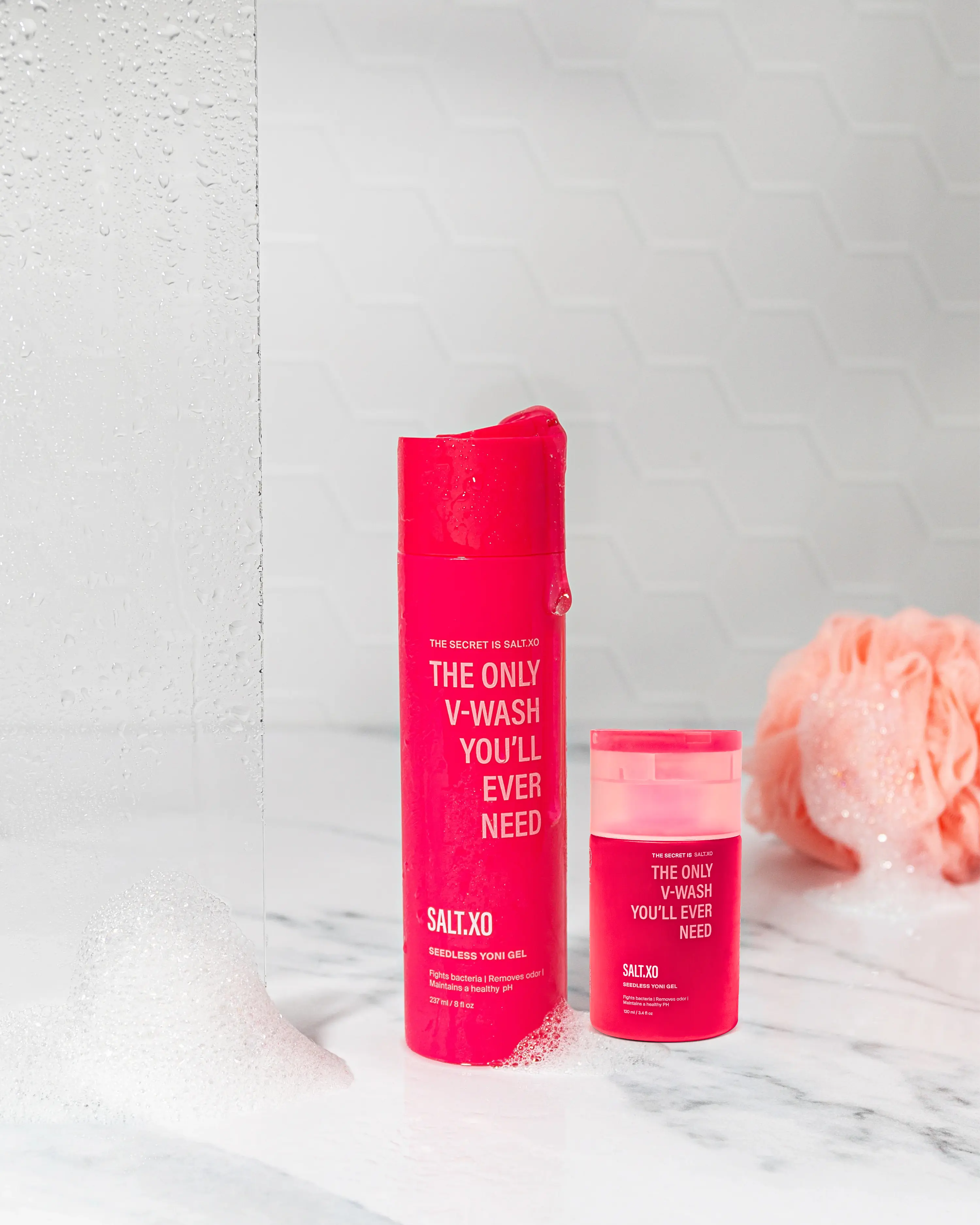 This bestselling Salt.Xo duo features a full-size 8oz cleanser and a 3.4oz travel mini—so your intimate care routine stays consistent, no matter where you are. Made to gently cleanse, support your pH, and leave you feeling fresh AF, each bundle pairs convenience with the formula that fits your body best. Whether you’re a fan of the OG or want a scent-powered glow-up, this duo keeps your softness ready 24/7.