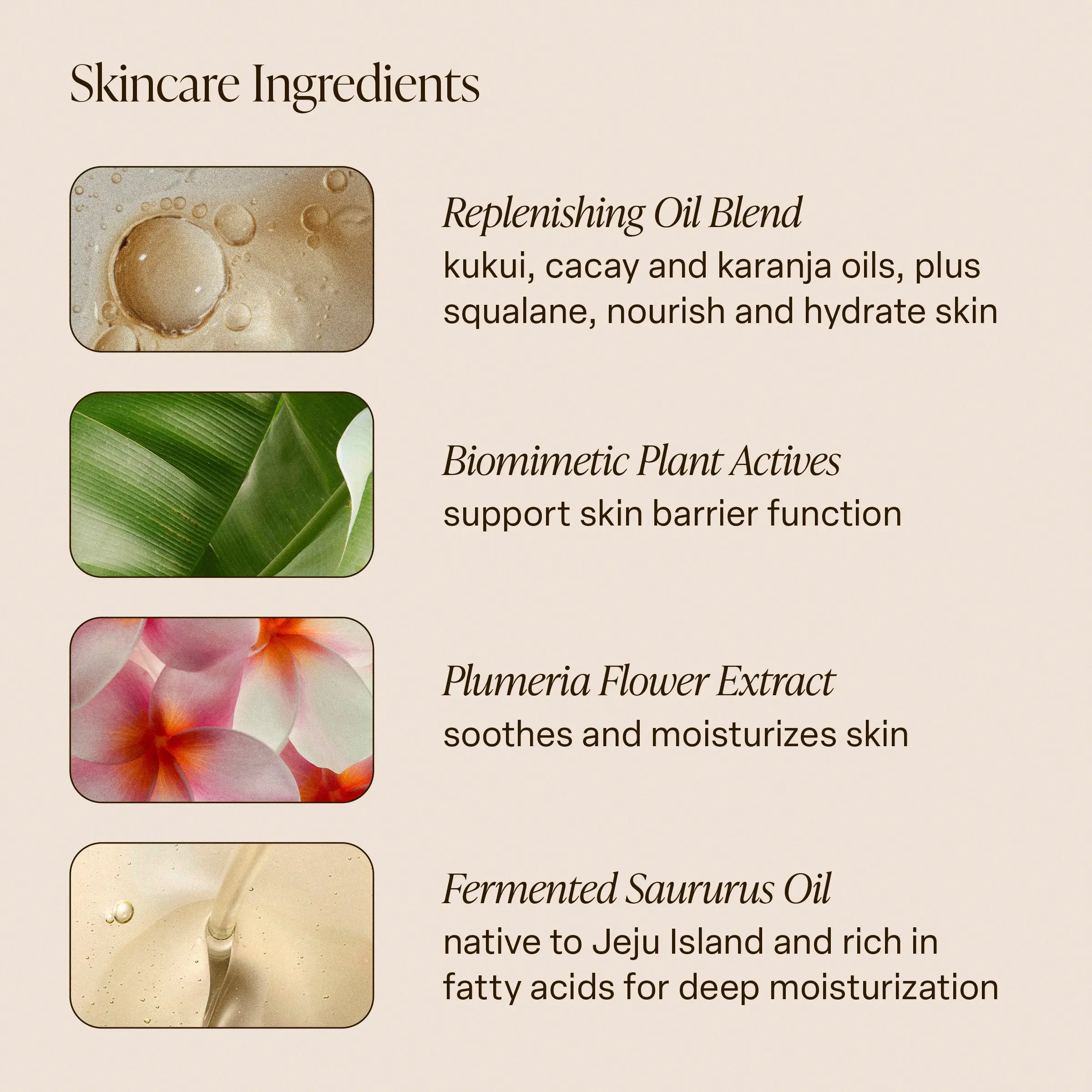 | Ingredients | Carthamus Tinctorius (Safflower) Seed Oil, Ricinus Communis (Castor) Seed Oil, Caprylic/Capric Triglyceride, Fragrance (Parfum), Limnanthes Alba (Meadowfoam) Seed Oil, Squalane, Tetrahexyldecyl Ascorbate, Plumeria Acutifolia Flower Extract, Pongamia Glabra (Karanja) Seed Oil, Caryodendron Orinocense (Cacay) Seed Oil, Aleurites Moluccanus (Kukui) Seed Oil, Curcuma Longa (Turmeric) Root Extract, Eclipta Prostrata Extract, Melia Azadirachta Flower Extract, Melia Azadirachta Leaf Extract, Corallina Officinalis Extract, Melia Azadirachta Bark Extract, Moringa Oleifera Seed Oil, Ocimum Basilicum (Basil) Flower/Leaf Extract, Ocimum Sanctum Leaf Extract, Pseudozyma Epicola/Apricot Kernel Oil/Olive Fruit Oil/Sunflower Seed Oil/Sweet Almond Oil/Saururus Chinensis Extract Ferment Extract Filtrate, Linoleic Acid, Lecithin, Phytosteryl Canola Glycerides, Oleic Acid, Palmitic Acid, Stearic Acid, Triolein, Tocopherol, Benzotriazolyl Dodecyl p-Cresol, Benzyl Salicylate, Citrus Aurantium Peel Oil, Limonene, Linalool, Coumarin, Hydroxycitronellal, Vanillin, Tetramethyl acetyloctahydronaphthalenes, Geranyl Acetate, Pinene, Isoeugenyl Acetate. |
