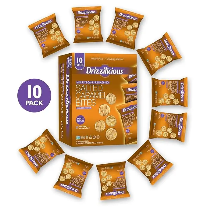 5. Drizzilicious Salted Caramel Mini Rice Cakes - Vegan, Gluten-Free, Crunchy & Healthy Snack, 90 Calories per Bag, 0.74 oz (Pack of 10) Tasty