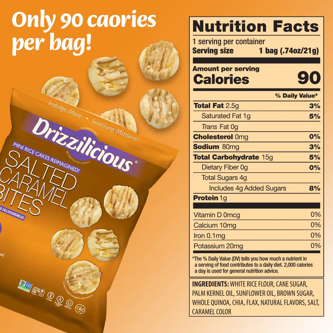 Our Drizzilicious Salted Caramel bites are mini rice cakes reimagined!