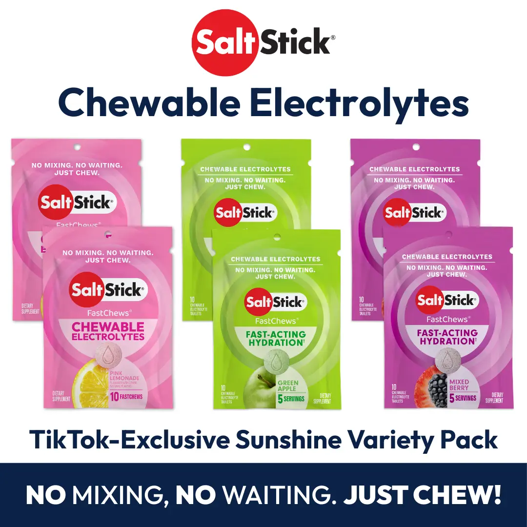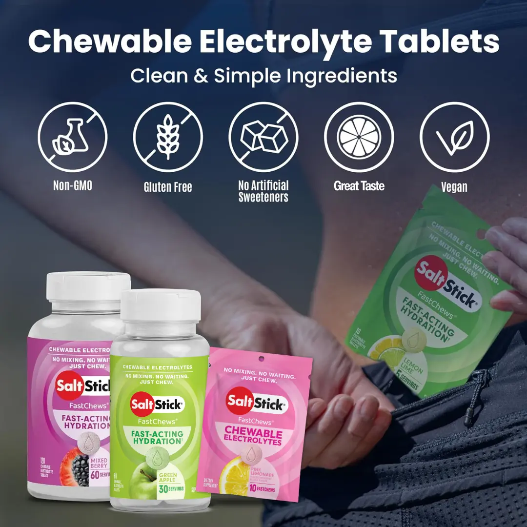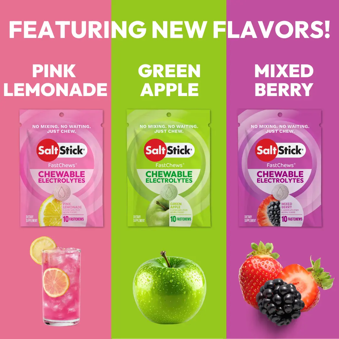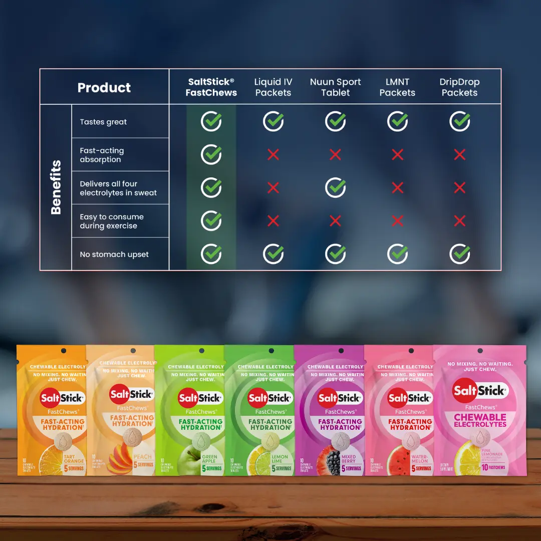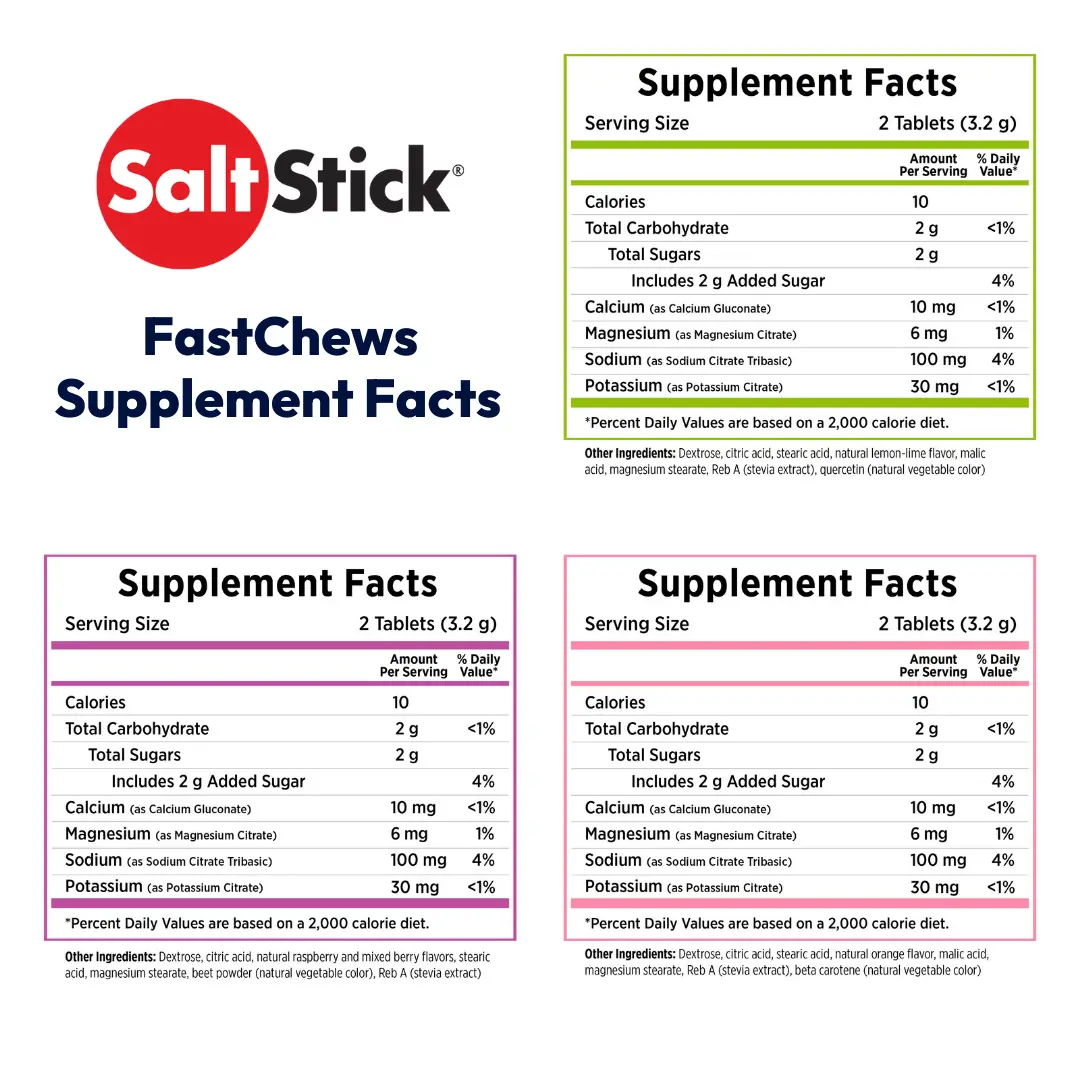 SaltStick electrolyte chews (FastChews) are designed for people who lose electrolytes through sweat and need a fast, convenient way to replenish them. Electrolytes like sodium, potassium, calcium, and magnesium help regulate hydration, muscle function, and physical performance.