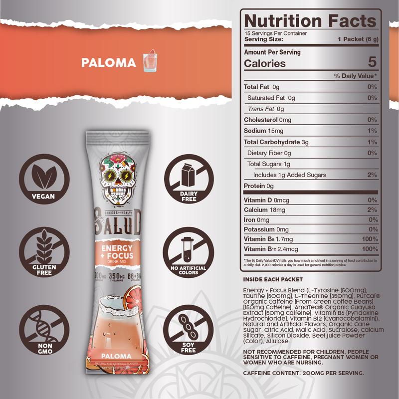 Salud 2-in-1 Energy Drink Powder + Focus, Paloma, Organic Caffeine, B6 & B12, L-Theanine, Vegan, Non-GMO, Gluten Free Beverage Sugar 90g - Dietary, Healthcare