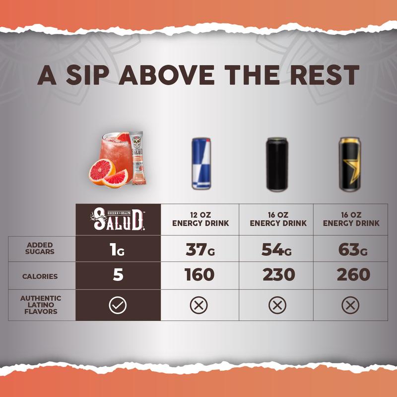 ·US vs THEM - Unlike traditional energy drinks loaded with sugars, Salud will turn plain water into a mouth-watering Agua Fresca drink with only 1g of added sugar and 5 calories per serving. You can feel good about starting your mornings and workouts with Salud!