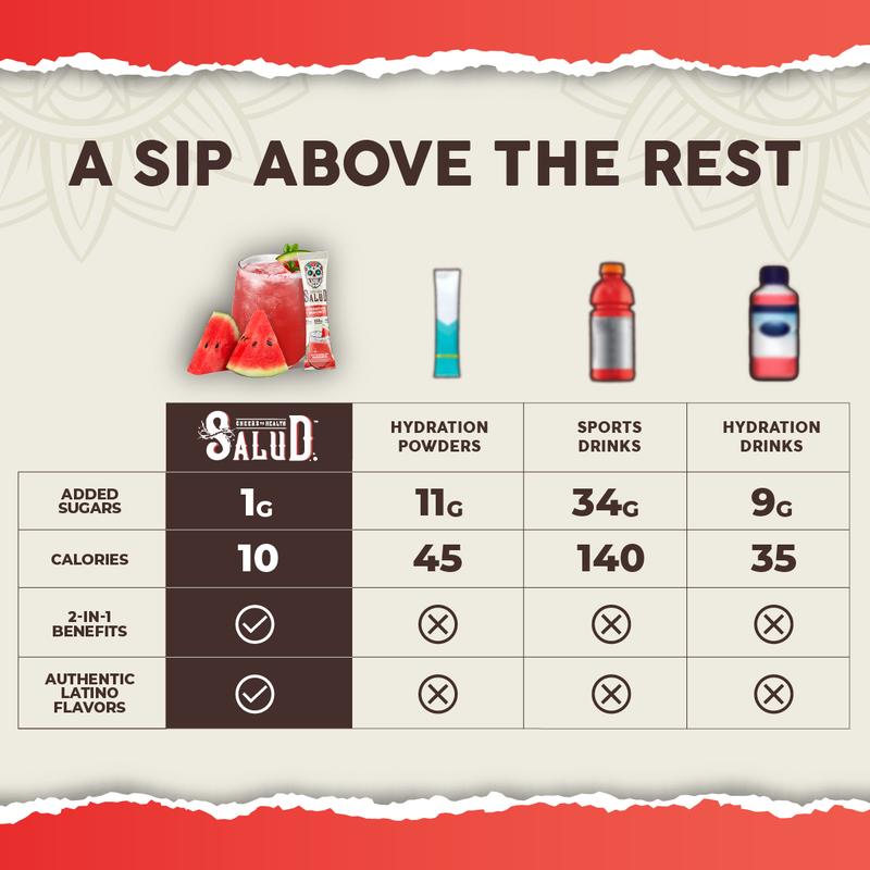 ·US vs THEM - Unlike other sports drinks and hydration multipliers that are loaded with sugars and artificial dyes, Salud will turn plain water into a mouth-watering Agua Fresca drink with only 1g of added sugar and 10 calories per serving. So delicious you might forget each serving is packed full of powerful benefits!