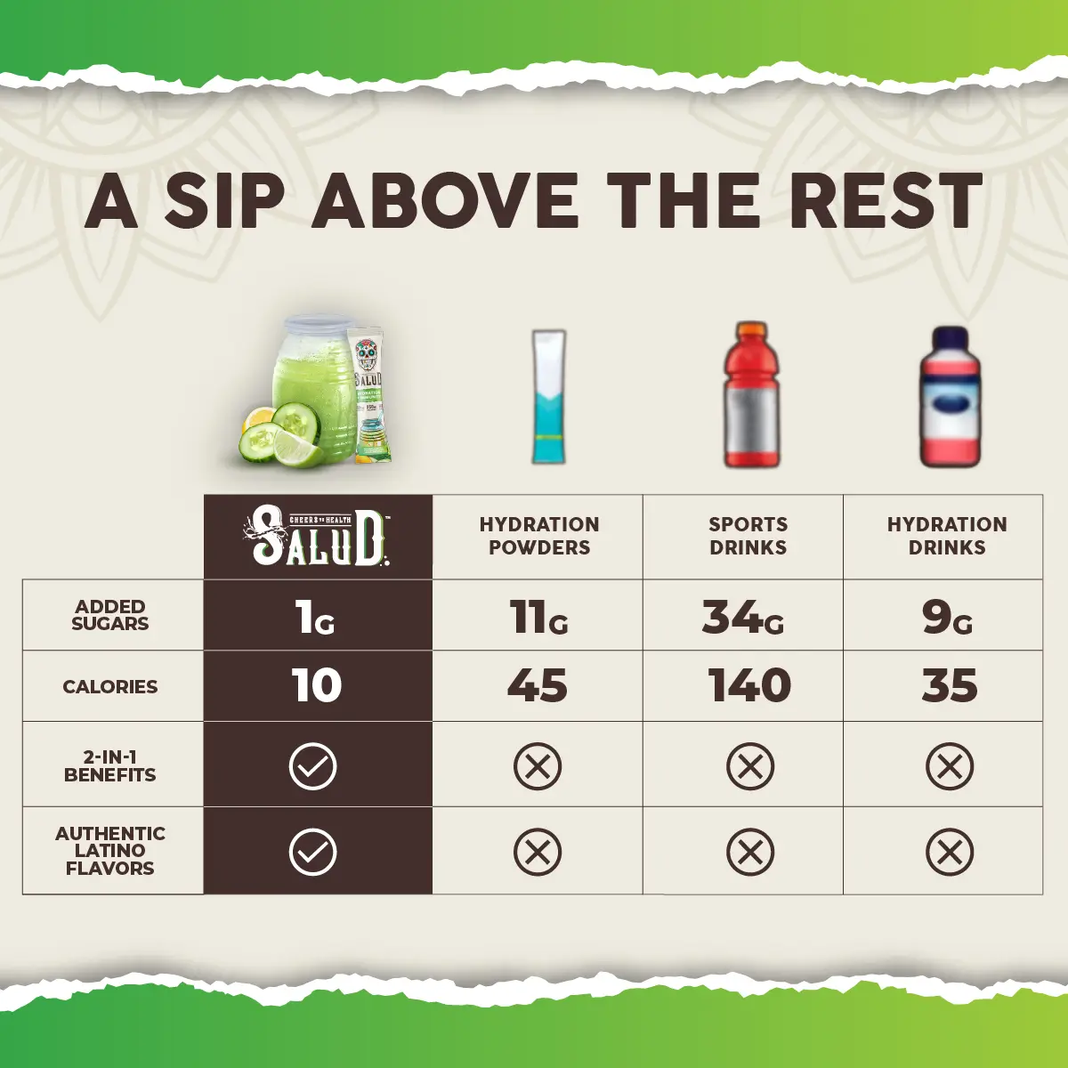 ·US vs THEM - Unlike other sports drinks and hydration multipliers that are loaded with sugars and artificial dyes, Salud will turn plain water into a mouth-watering Agua Fresca drink with only 1g of added sugar and 10 calories per serving. So delicious you might forget each serving is packed full of powerful benefits!
