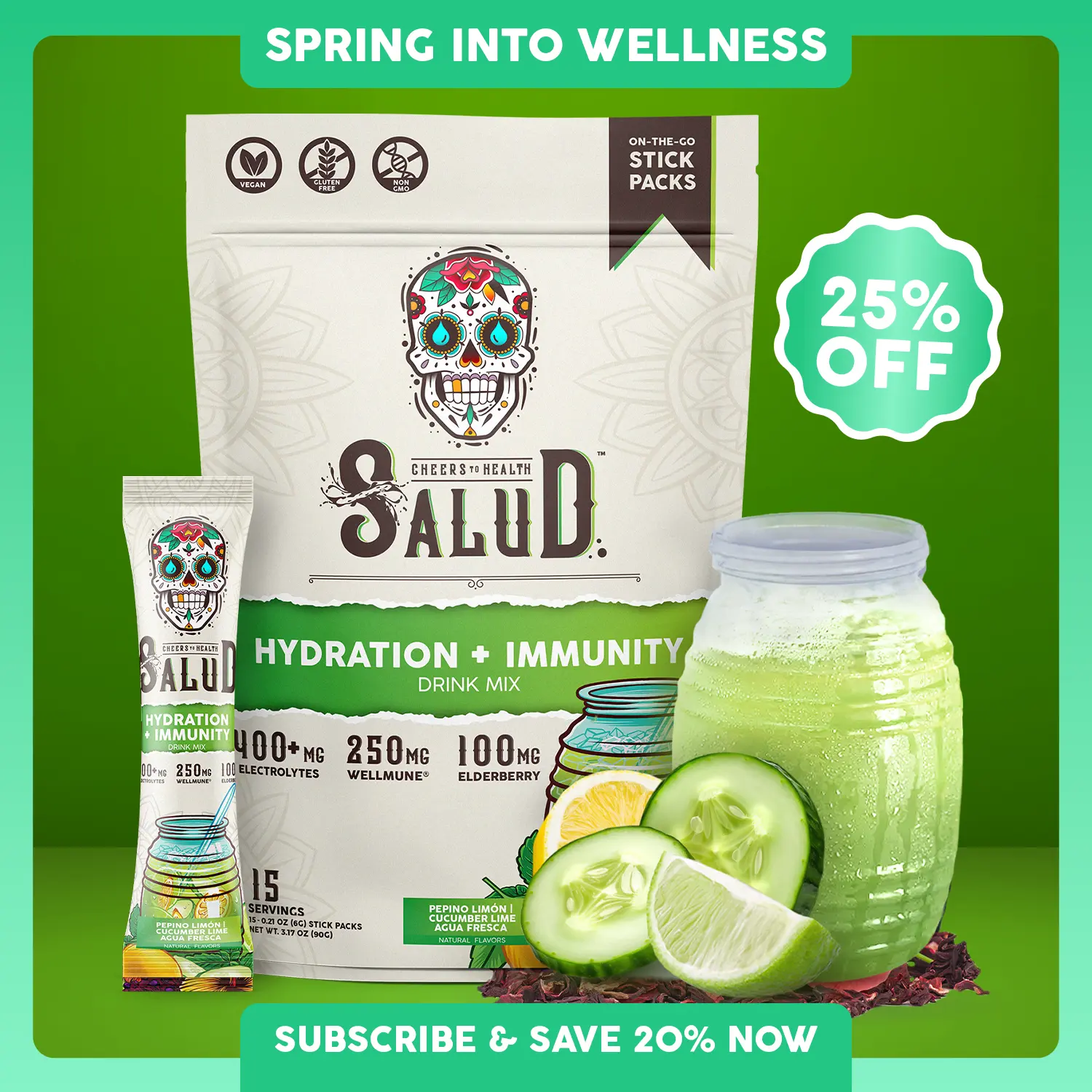 Salud 2-in-1 [Hydration & Immunity - Cucumber Lime] Electrolytes Powder, Agua Fresca Drink Mix, Elderberry, Dairy & Soy Free, Non-GMO, Gluten Free, Vegan, Low Calorie, 1g Sugar (15 Servings) , Spring Glow Up