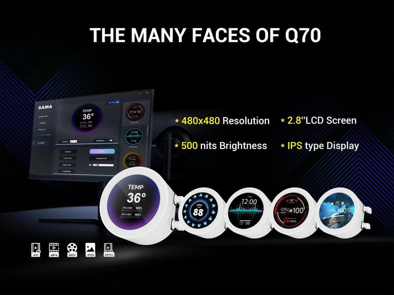 Introducing the SAMA Q70, a 360 AIO with an LCD screen that brings modular functionality for enhanced customization. It seamlessly blends high-performance cooling with striking design, delivering a dynamic PC cooling experience that balances aesthetics and efficiency.