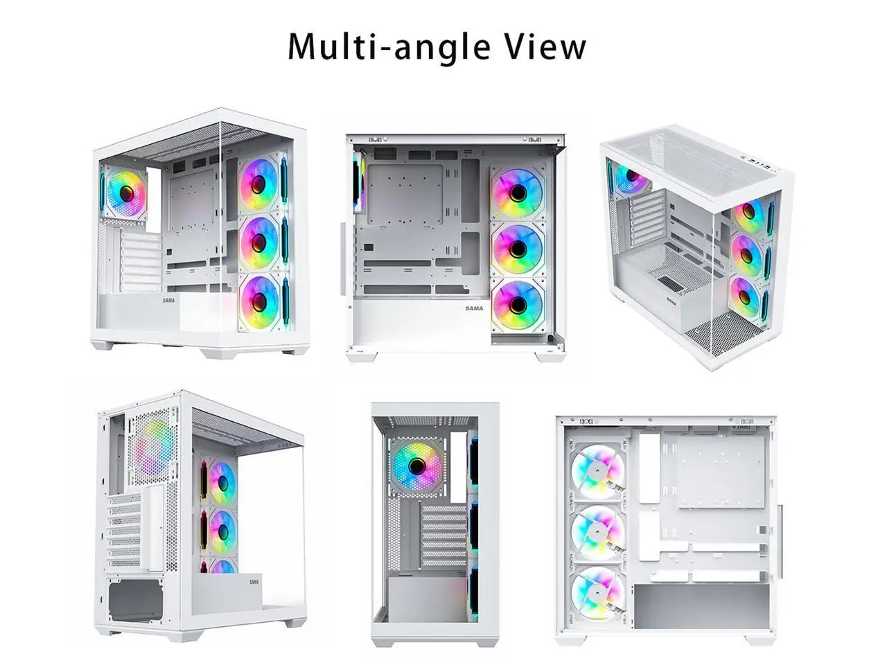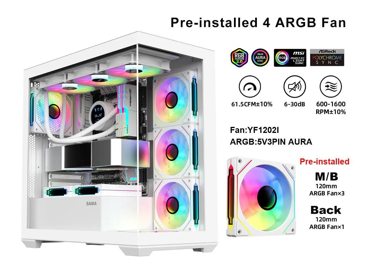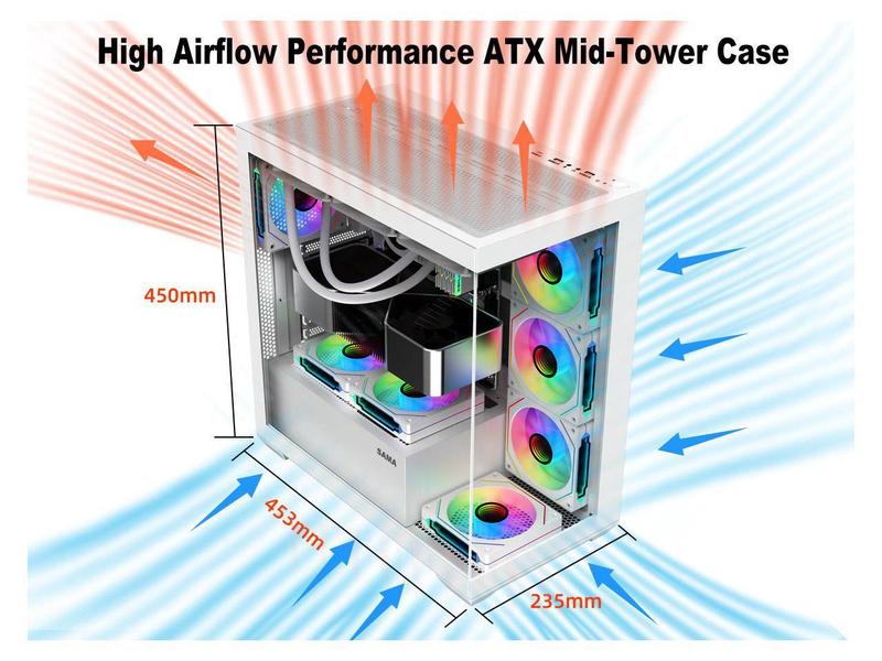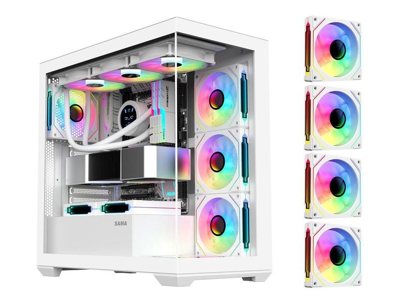 SAMA ATX White Computer Gaming PC Case with ARGB Fans Pre-Installed, Tempered Glass Transparent Side Panel, Fans and Liquid cooler are addable