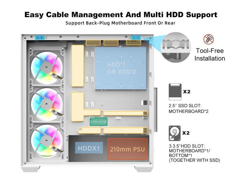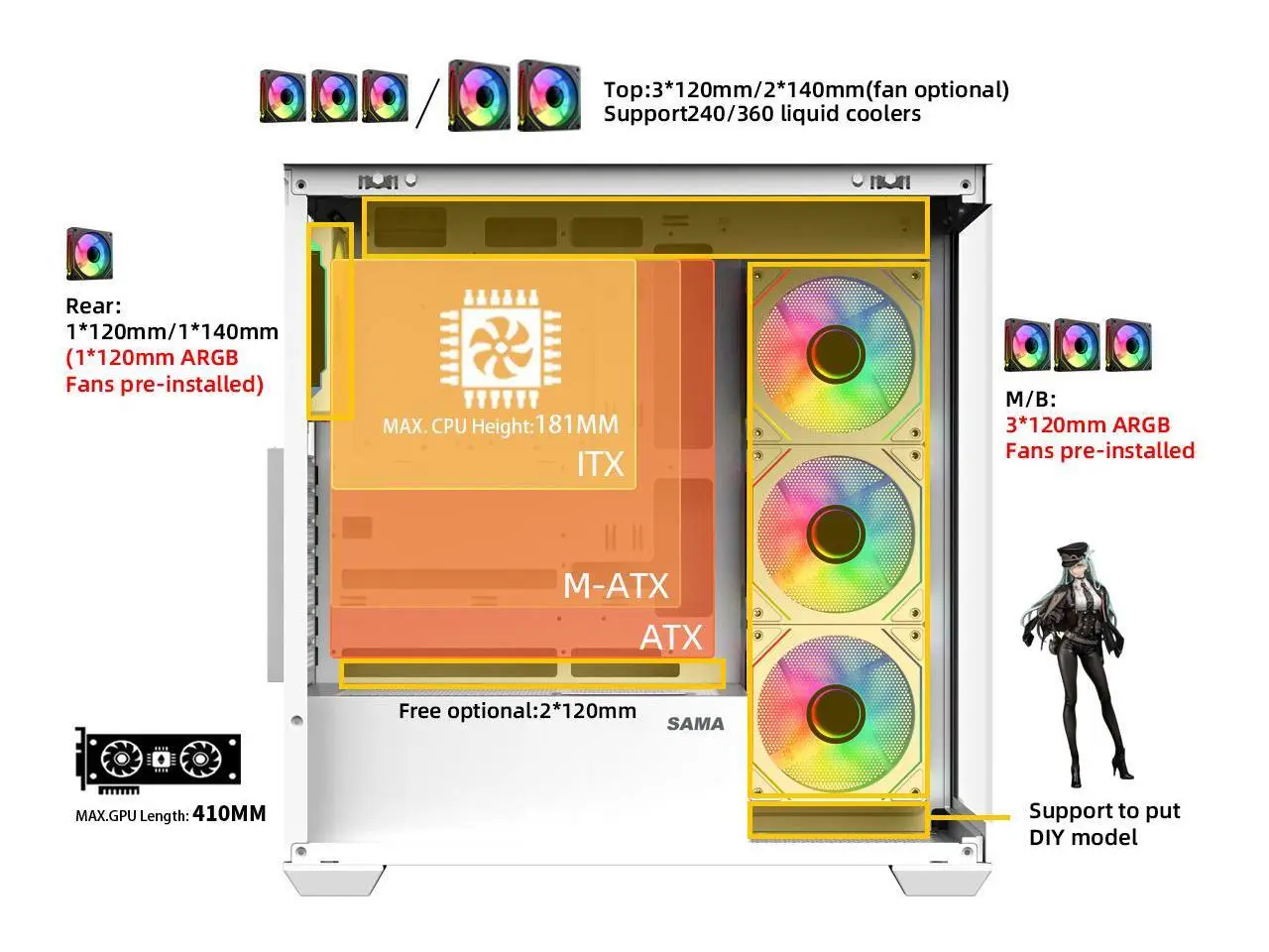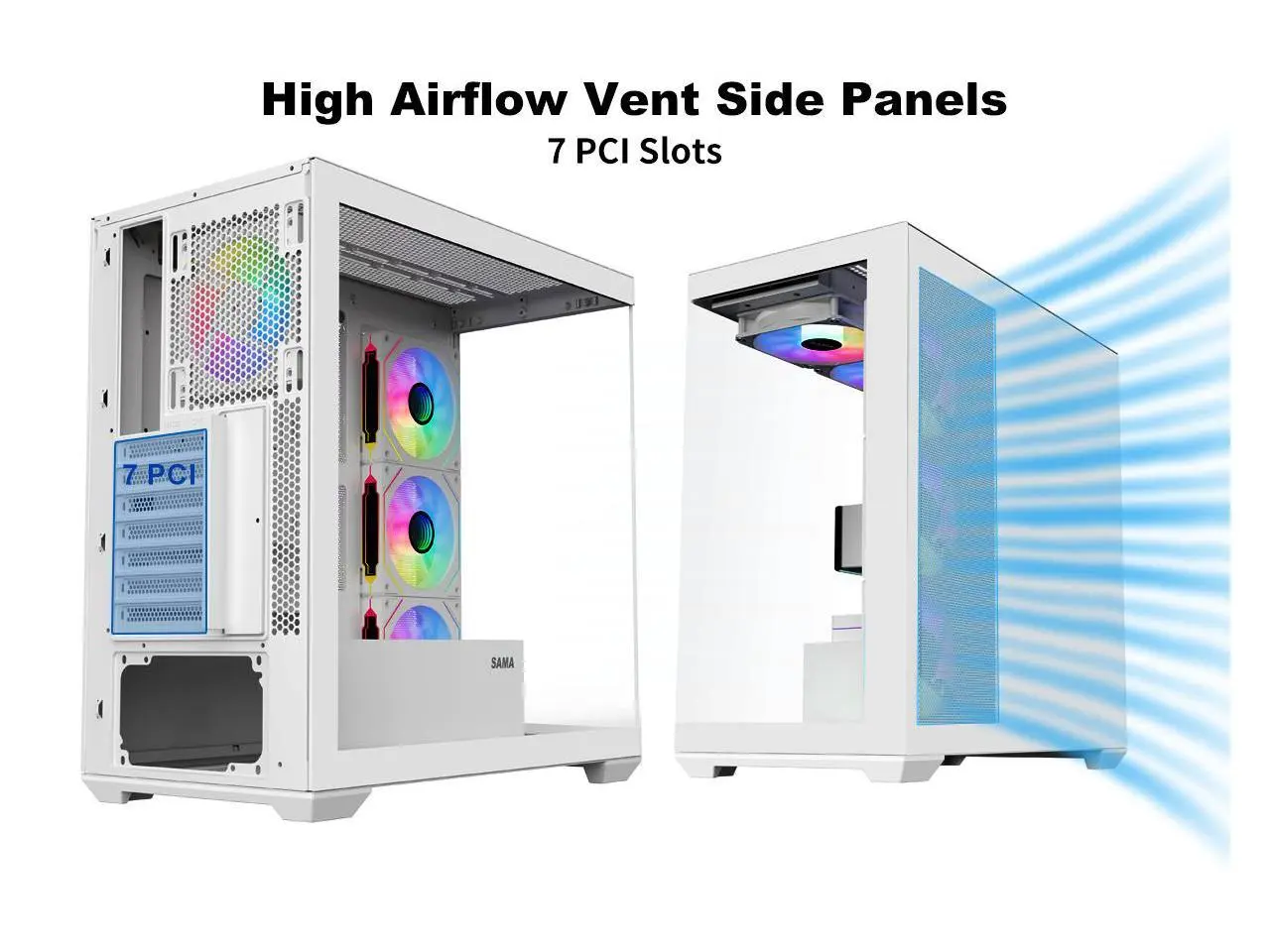 SAMA ATX White Computer Gaming PC Case with ARGB Fans Pre-Installed, Tempered Glass Transparent Side Panel, Fans and Liquid cooler are addable