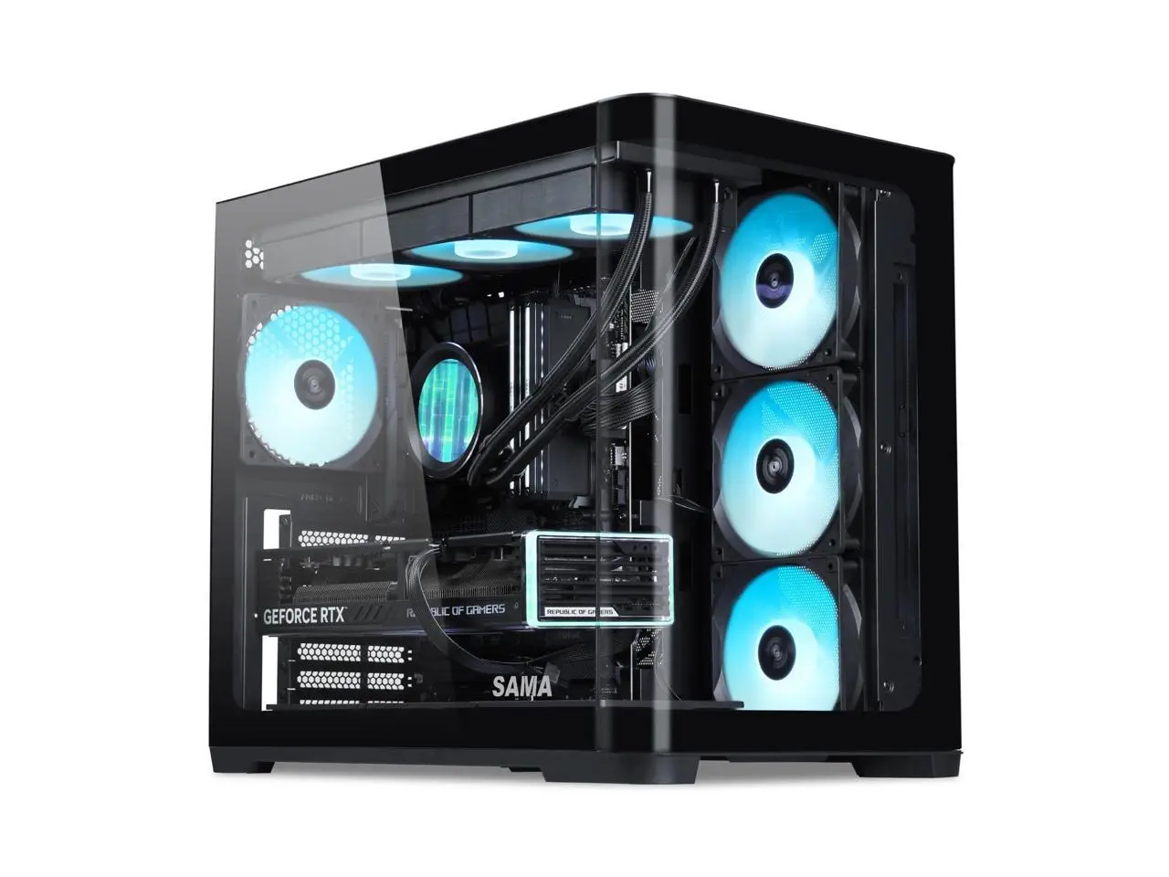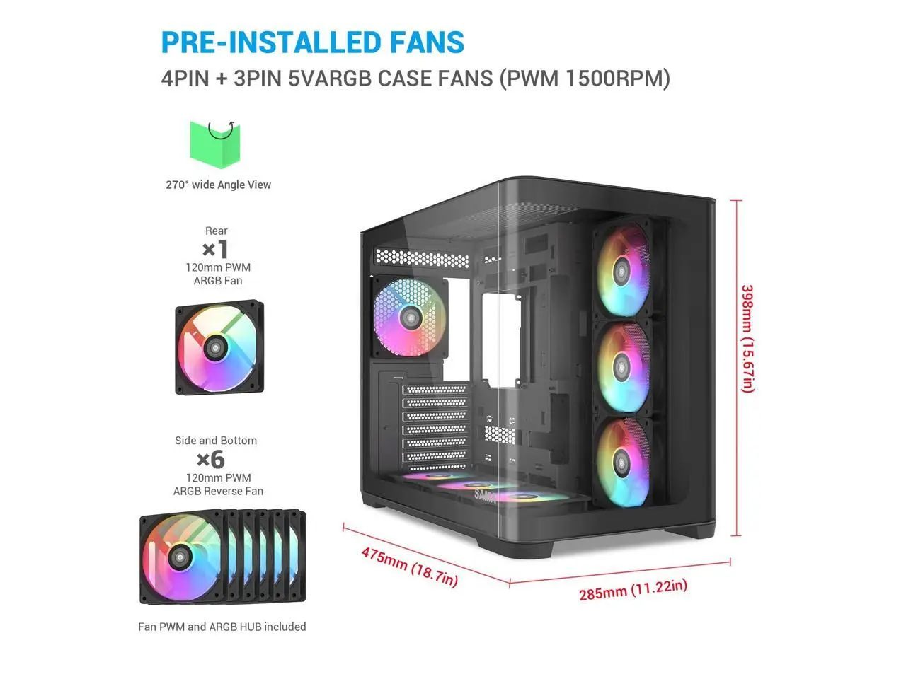 5. SAMA V60 PC Case, Mid-Tower Computer Case, A Curved Tempered Glass, 7 Pre-Installed ARGB PWM Fans and Fan Hub, USB Type-C, ATX/MATX/ITX Back-Connect Support, 360mm Liquid Cooler Compatible, Black