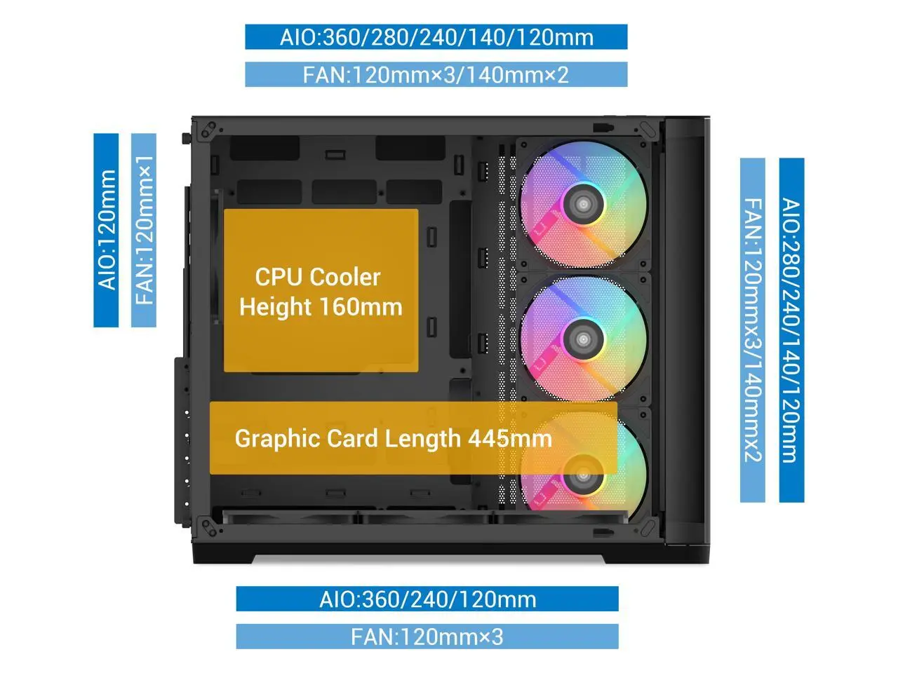 The SAMA V60 case showcases a stylish dual-chamber design, featuring elegantly curved left and front panels for an appealing, modern look. The right side panel is equipped with two large mesh sections, enhancing airflow and enabling compatibility with up to 10 fans for impressive cooling power. This combination of aesthetics and high-performance functionality makes the V60 case a perfect choice for a build that prioritizes both visual appeal and cooling efficiency.