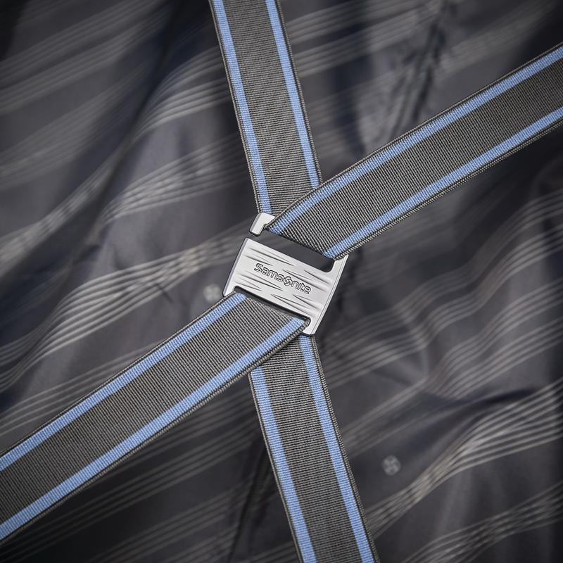 Spacious packing compartments feature elastic cross straps custom designed with a pop of color to match exterior and zipped divider panel