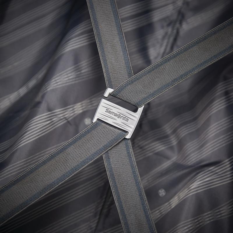 Spacious packing compartments feature elastic cross straps custom designed with a pop of color to match exterior and zipped divider panel