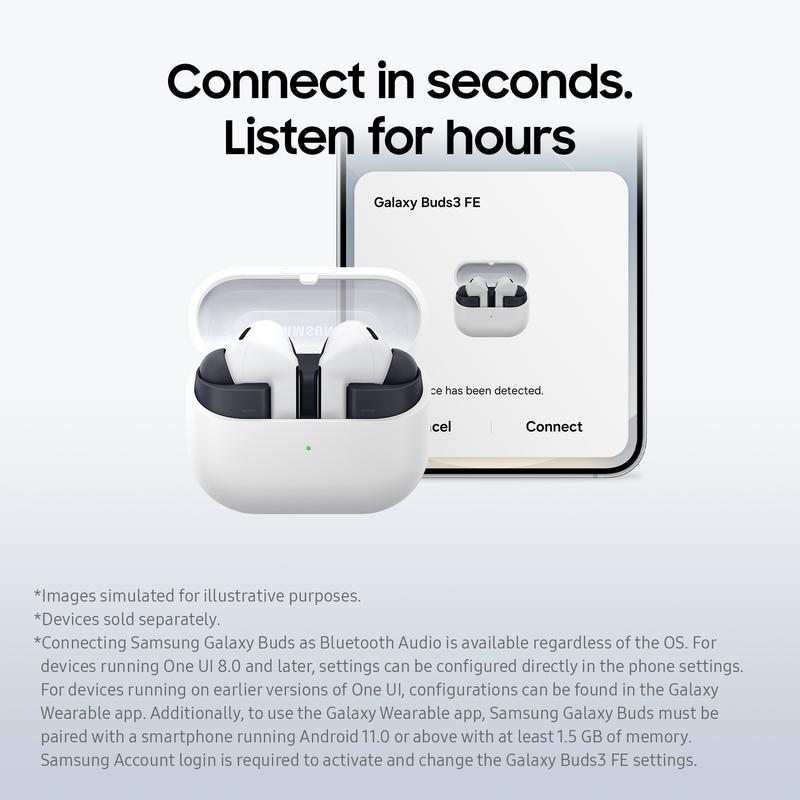 ·MOVE BETWEEN YOUR GALAXY DEVICES. YOUR BUDS FOLLOW: Seamlessly connect and switch between your Galaxy devices. Galaxy Buds3 FE pair⁶ effortlessly and automatically switch between your phone to Tab to PC, as per your needs.⁷