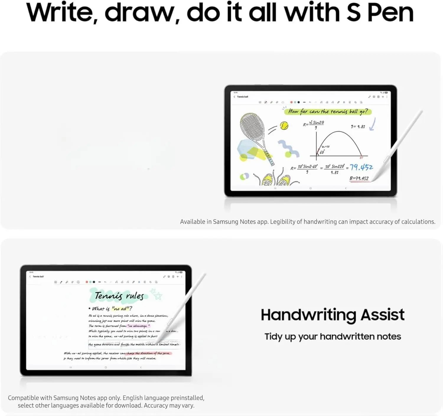 ·WRITE, DRAW, DO IT ALL: S Pen is mightier than your average writing tool. The responsive design and intuitive integration with intelligent features make drawing, jotting down notes and even doing math easier than ever