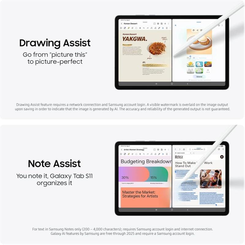 ·SUMMARIZE IN A SNAP: Capture ideas in meetings or brainstorming and skip the cleanup. Note Assist⁵ on Galaxy Tab S11 summarizes and formats them with Galaxy AI,¹ keeping everything neatly organized so you can find what you need in seconds.