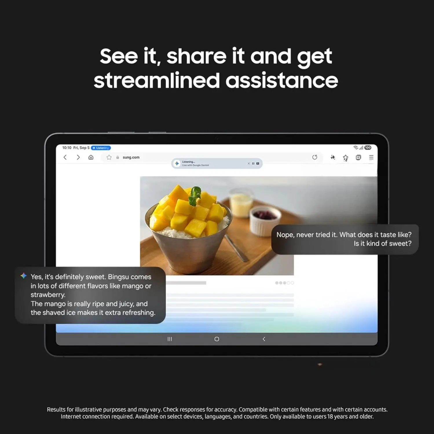 ⁷Results for illustrative purposes and may vary. Check responses for accuracy. Compatible with certain features and with certain accounts. Internet connection required. Available on select devices, languages, and countries. Only available to users 18 years and older.