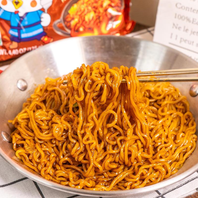 Combining Korean Buldak with Japanese sauces, these noodles offer a bold, spicy taste with a sweet and sour twist. Inspired by Japanese yakisoba, they feature a special sauce from traditional festival snacks. The original Korean spicy sauce is enhanced with Japanese soy and Worcestershire sauces.