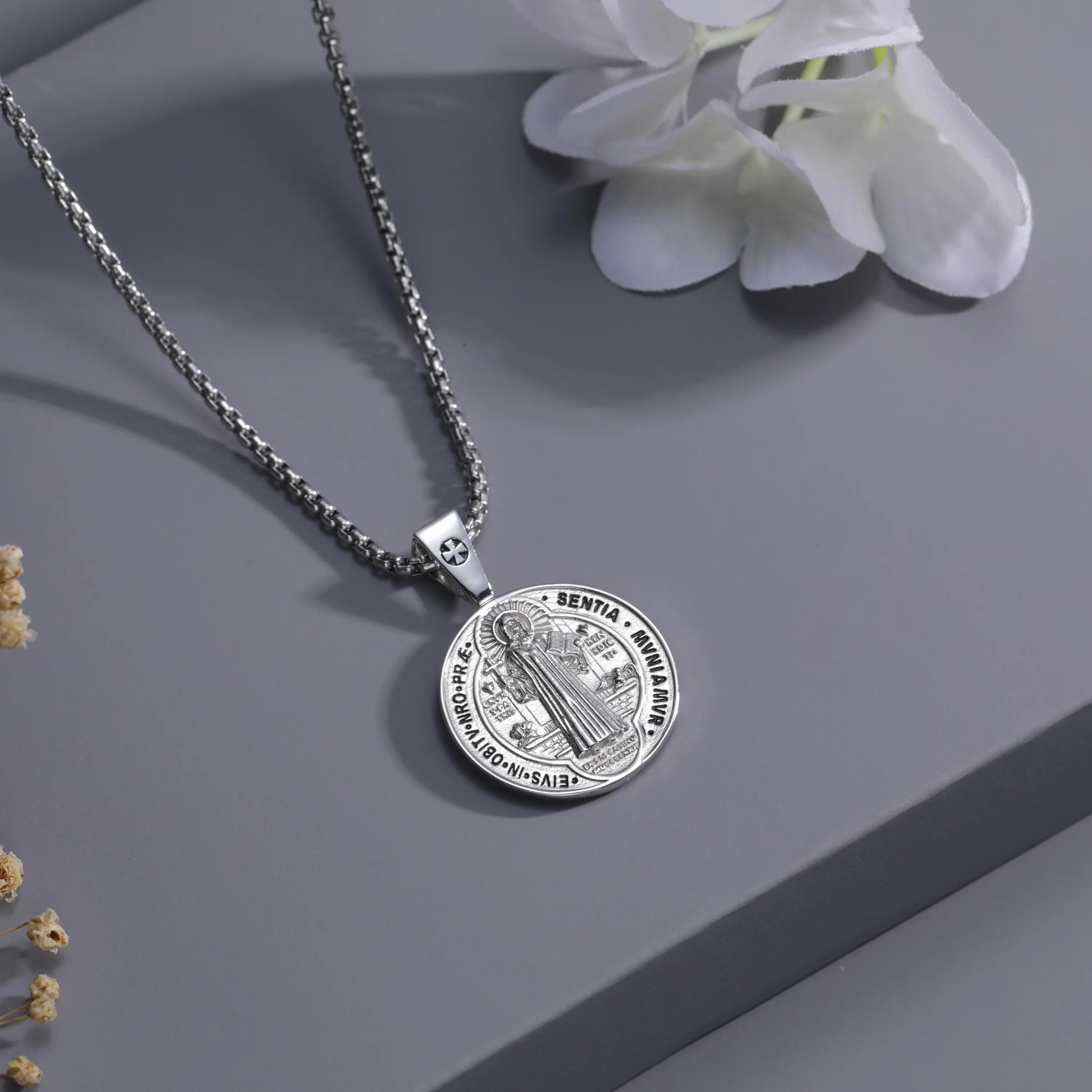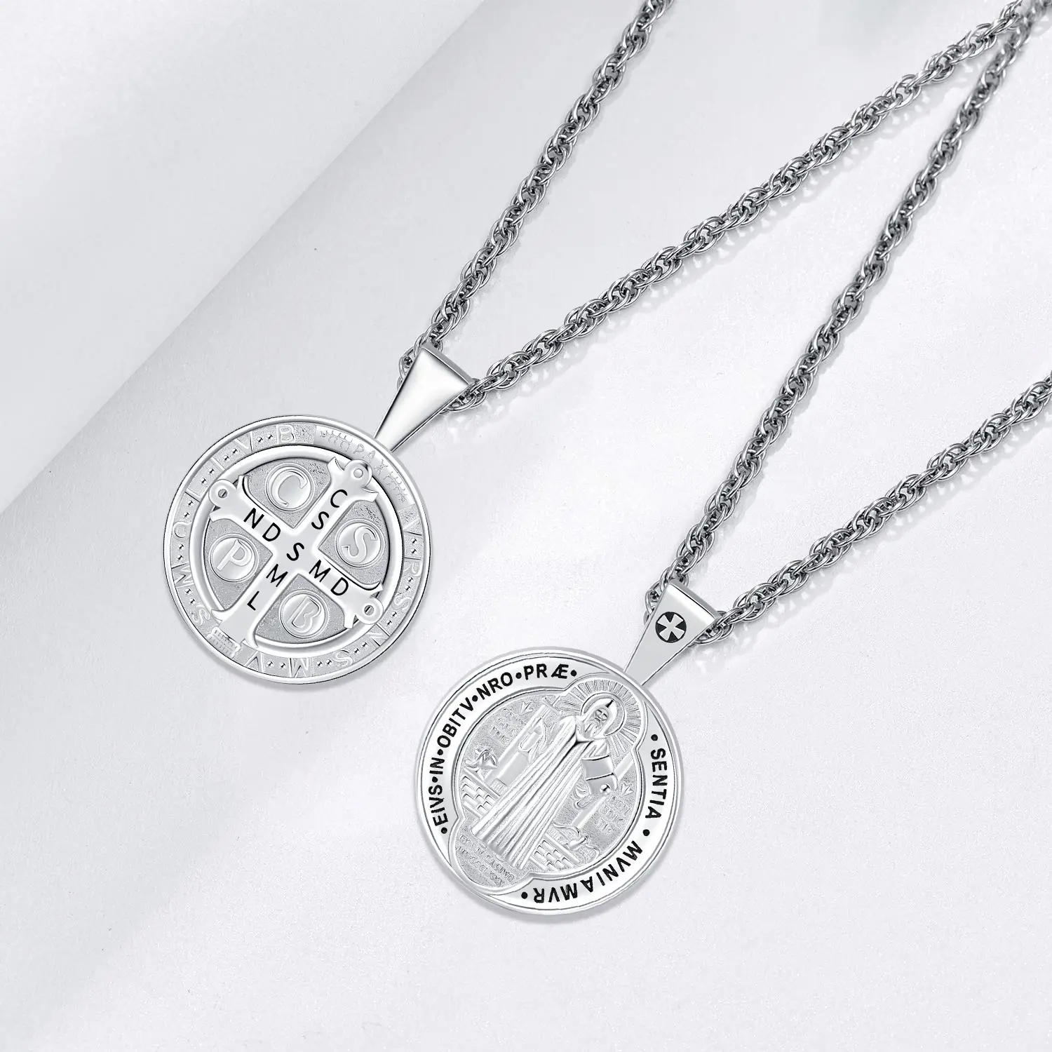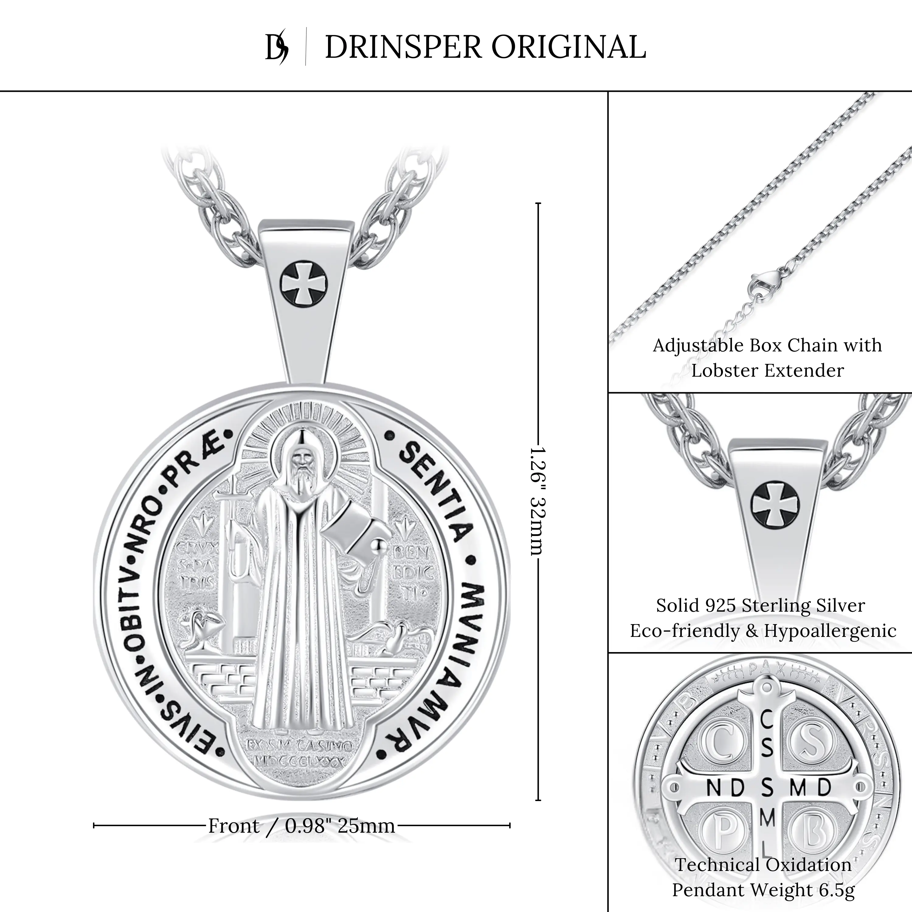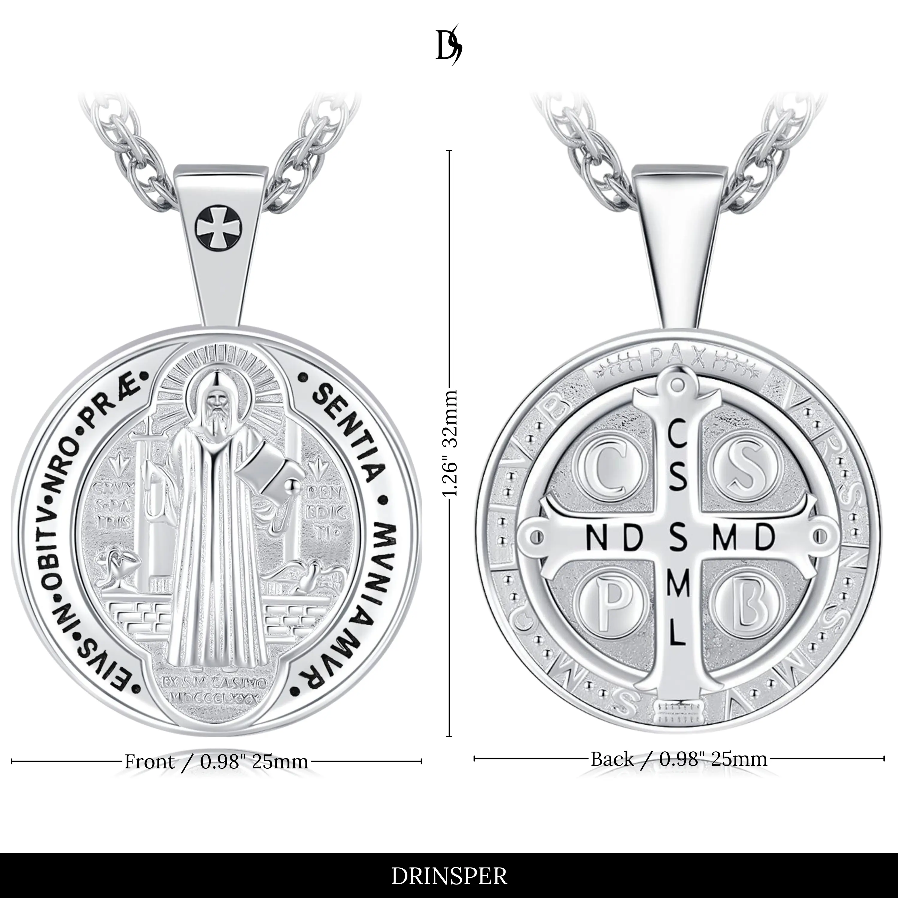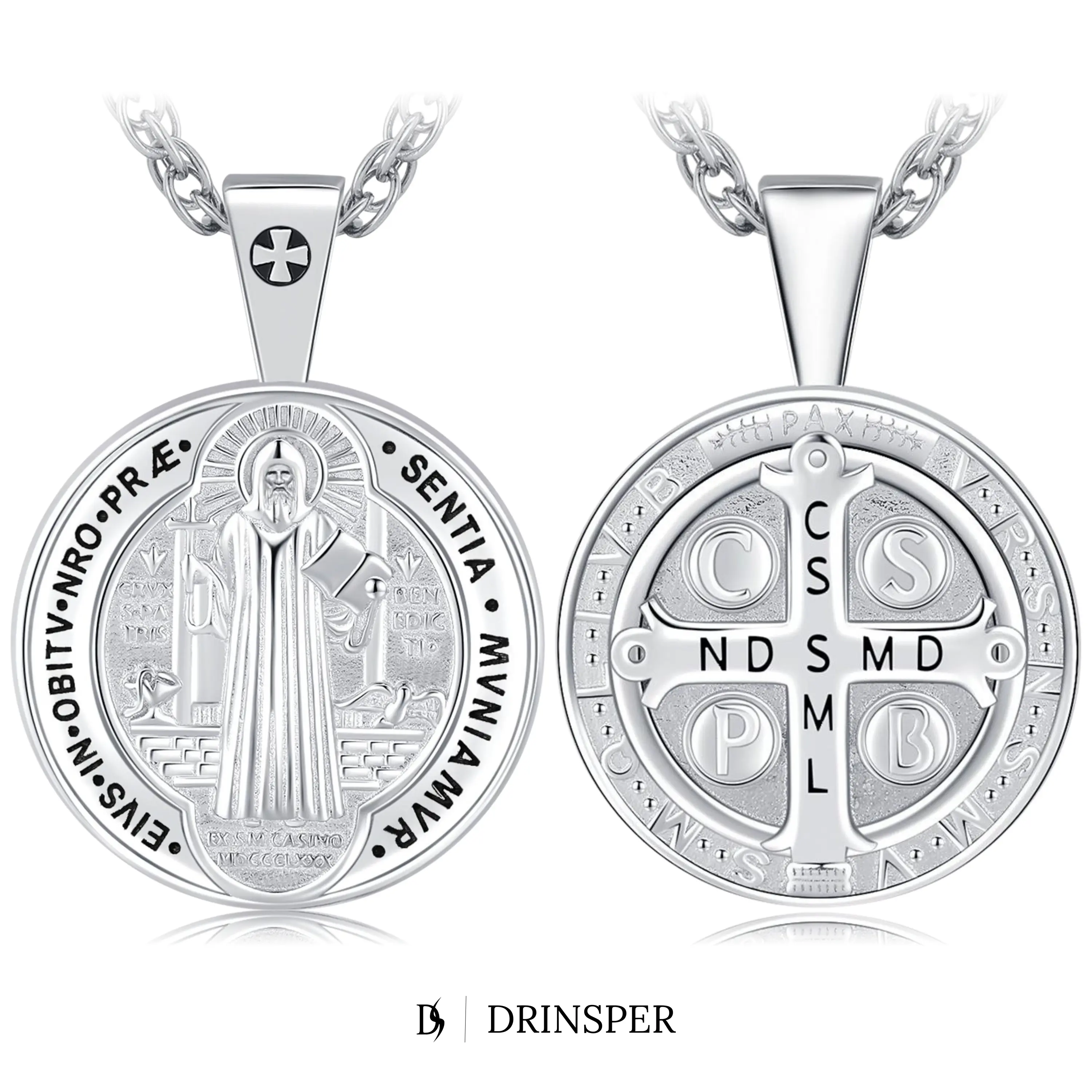 Crafted in solid S925 sterling silver, the DRINSPER Saint Benedict—also known as San Benito / Medalla de San Benito necklace is a respected sacramental symbol of faith and protection, refined for daily wear and meaningful gifting.