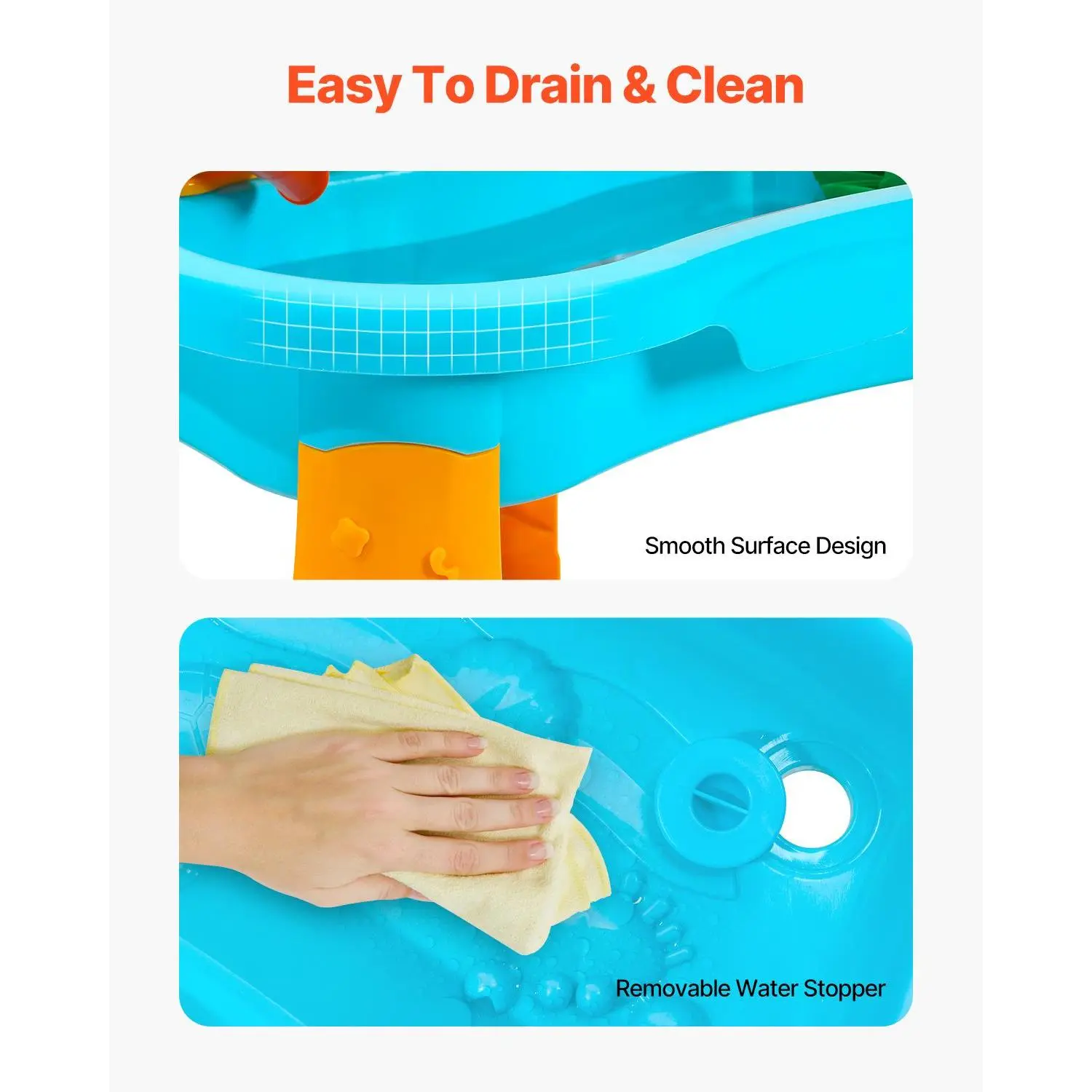 • Easy to Clean: This outdoor summer water table is equipped with removable water stopper for fast and easy drainage to avoid water buildup. Its smooth surface design makes it easy to wipe away water drops and stains on the surface, creating a sanitary play area.