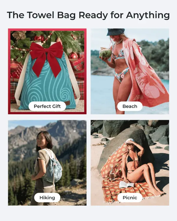 Every Beach lover's dream! I absolutely love how this beach bag that can fit all sorts of things in it just turns into a towel. Also the towel is way bigger than me and I'm 5'7. Definitely recommending this to all of my friends and going back for more designs!