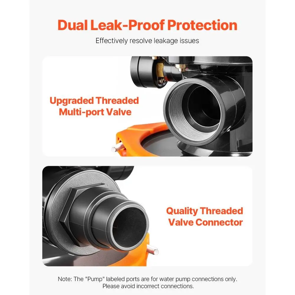 ·Double Leak-Proof Protection: Built with a threaded multi-port valve and durable threaded connections, this sand filter pump tackles common leaks head-on, ensuring a secure, leak-free experience. Plus, it's equipped with an Intex connector for easy setup with Intex pools. Ideal for both home and commercial pools, including backyard pools, community pools, and even small water parks
