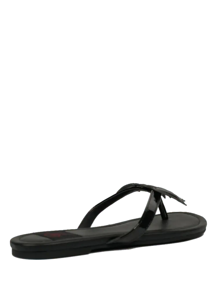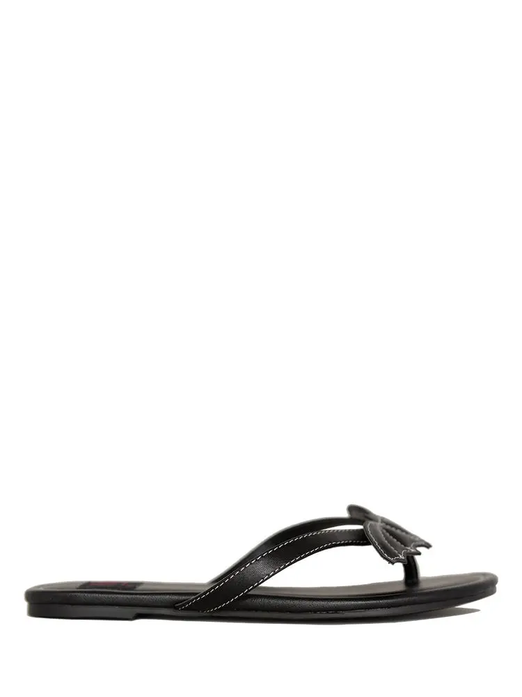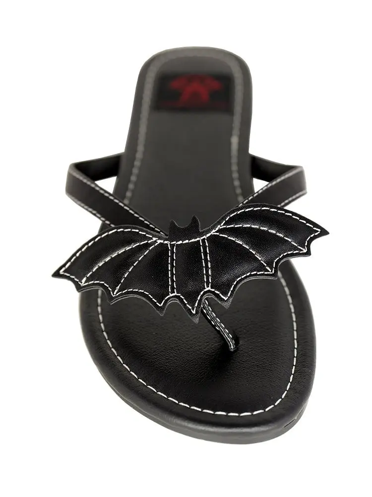 BAT! This stunning sandal features a black vegan leather upper and lining, with elegant white top stitch detailing and a durable black rubber outsole.