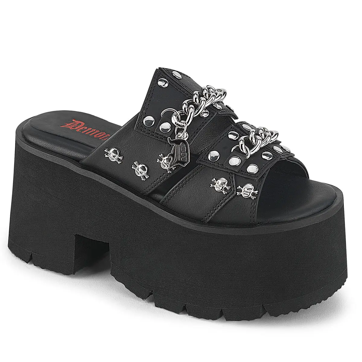 I usually get a size 9 in demonias but I went with a size 8. I could have went with a size 9 but the 8 will do. My foot isn’t hanging off the end.My foot is neither narrow or wide, somewhat in the middle. They are surprisingly lightweight. Also the heel and platform is a foam material