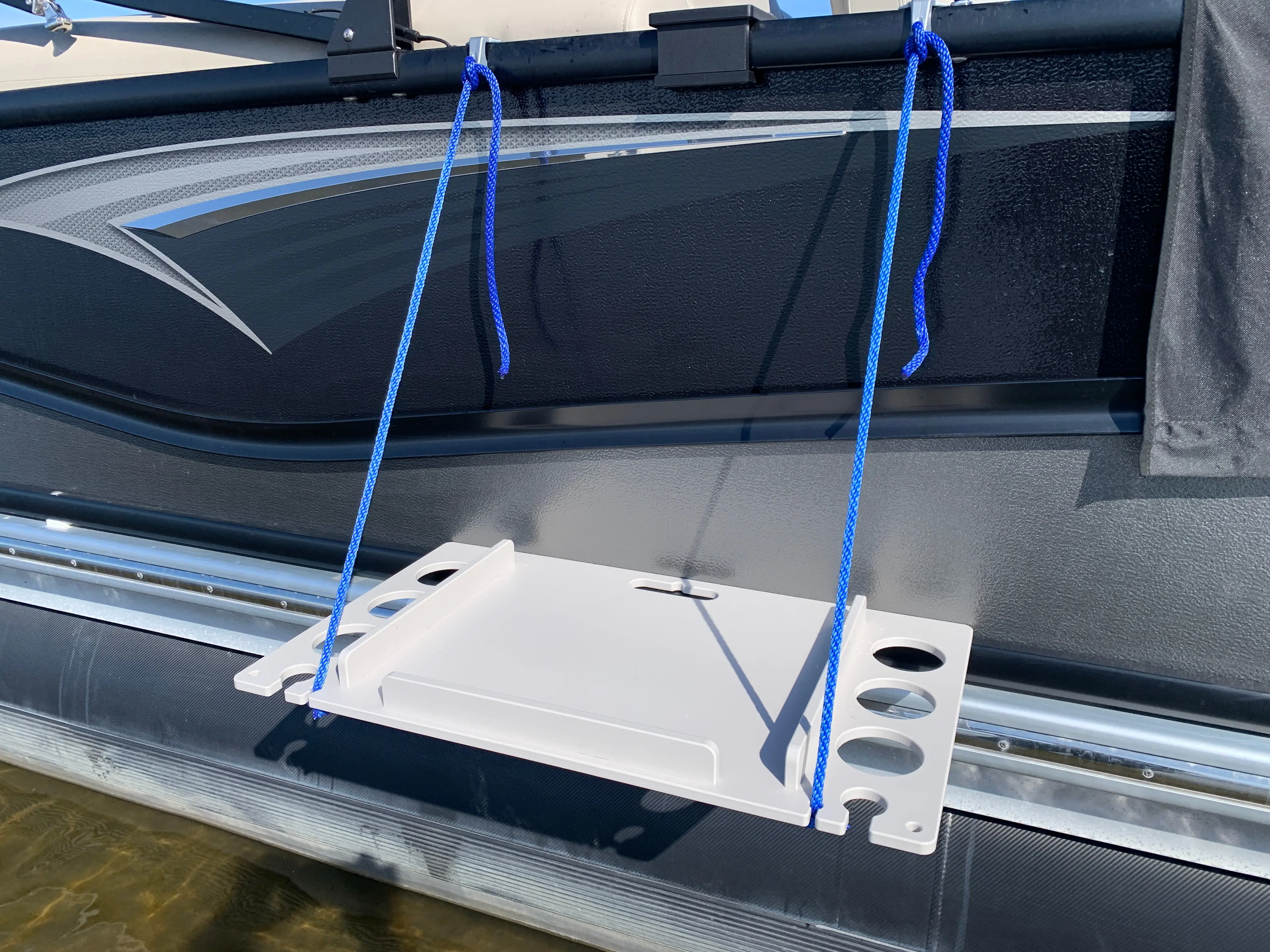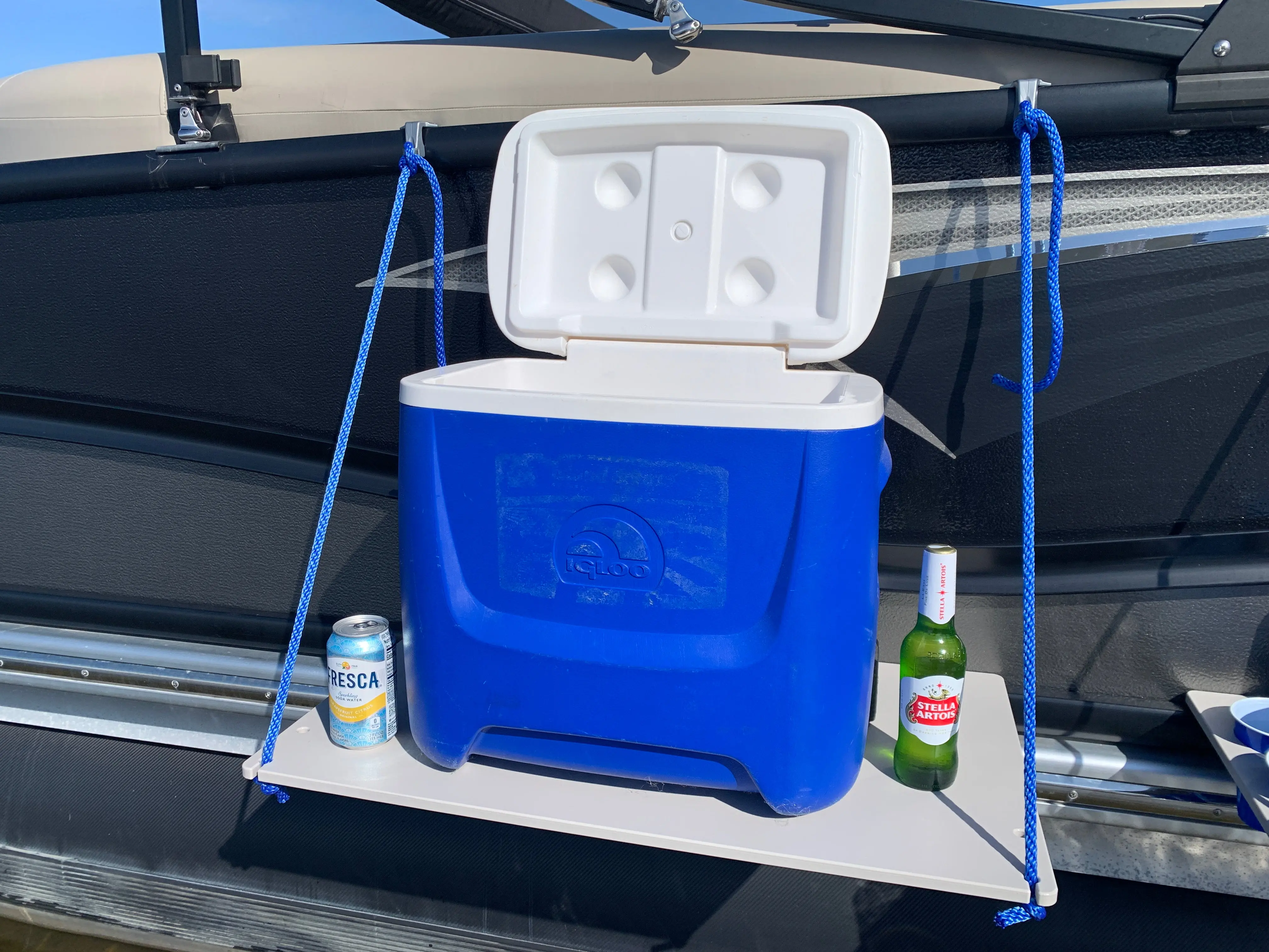 The Sandbar Pontoon Table easily connects to the exterior of the pontoon with simple easy to install fender hangers and support ropes (Pre Assembled). The Sandbar Table is easily moved from inside the pontoon to the exterior when needed, Lightweight, yet very strong to support even the most heavily loaded coolers.