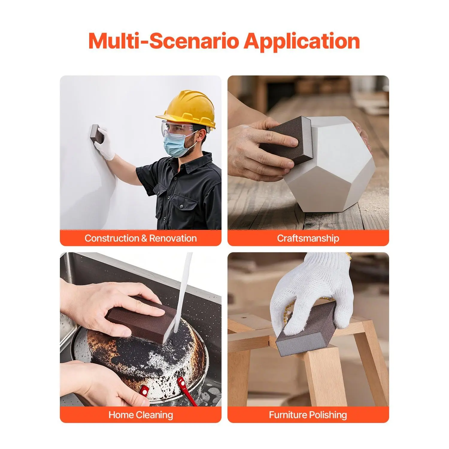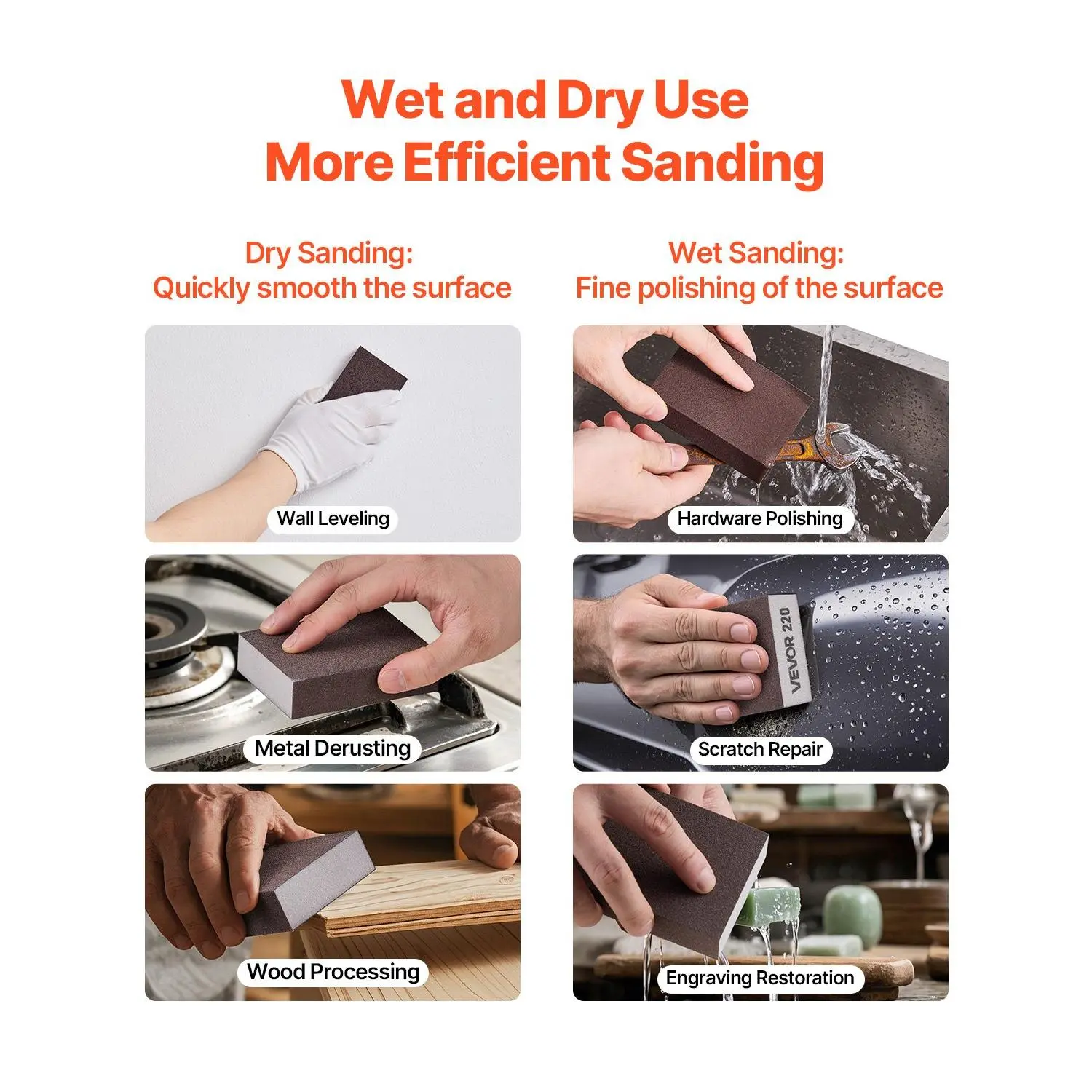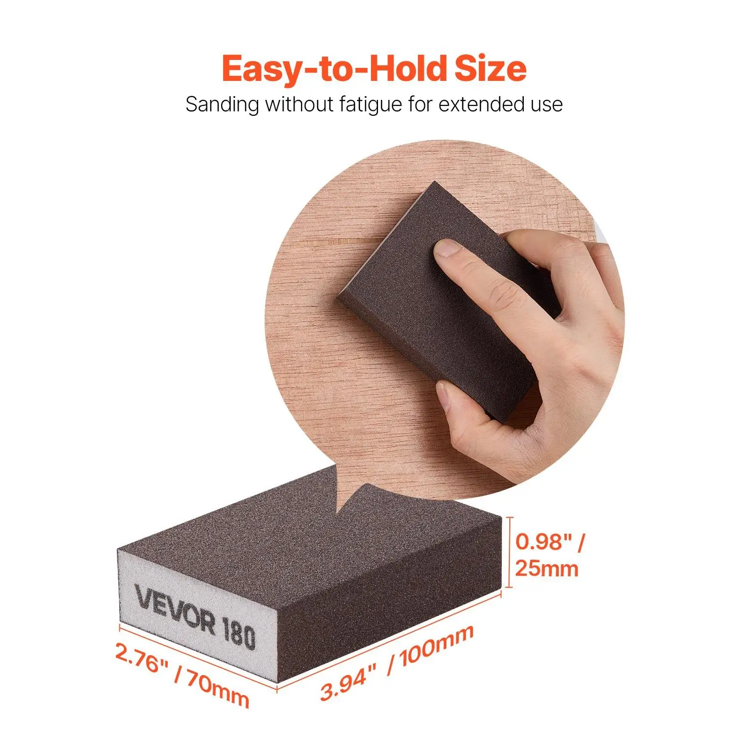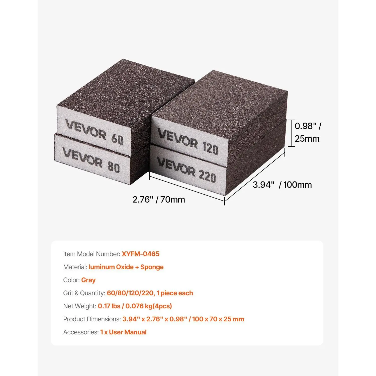 Multiple Grits: This set includes 60/80/120/220 grit sanding blocks (1 each), ranging from coarse to fine, ideal for woodworking, metal, and furniture polishing.Easily select the right grit for your project needs.Long-Lasting Durability: Made with sponge and aluminum oxide abrasives, these sanding sponges are crack-free, flexible, tear-resistant, and reusable, providing consistent sanding performance without frequent replacements.Wet & Dry Use: Our sandpaper blocks are ideal for both dry sanding (wall leveling, metal rust removal, woodworking) and wet sanding (hardware polishing, scratch repair, engraving).One set meets all sanding needs.Easy to Use: Each sanding block (3.94" x 2.76" x 0.98") is suitable for handheld use, ideal for sanding irregular shapes and curved surfaces.Broad Application: Our drywall sanding blocks are also suitable for wood (furniture polishing, carving repairs), metal (hardware polishing, rust removal), plastic (product polishing, scratch repairs), and construction (wall putty sanding, decorative crafts).VEVOR Sanding Sponge, 4 Pcs, 60/80/120/220 Grit Assortment, Washable and Reusable Sanding Blocks for Dry & Wet Use, Coarse to Fine Sandpaper Blocks, for Polishing Drywall Wood Plastic Metal Furniture