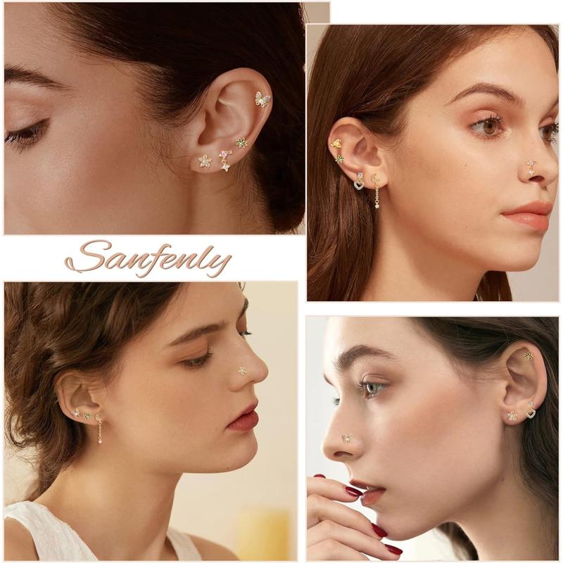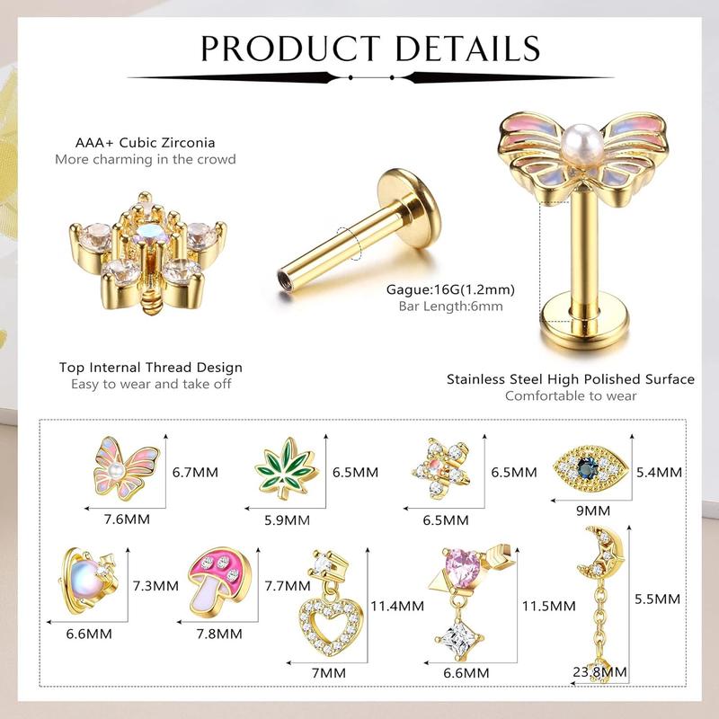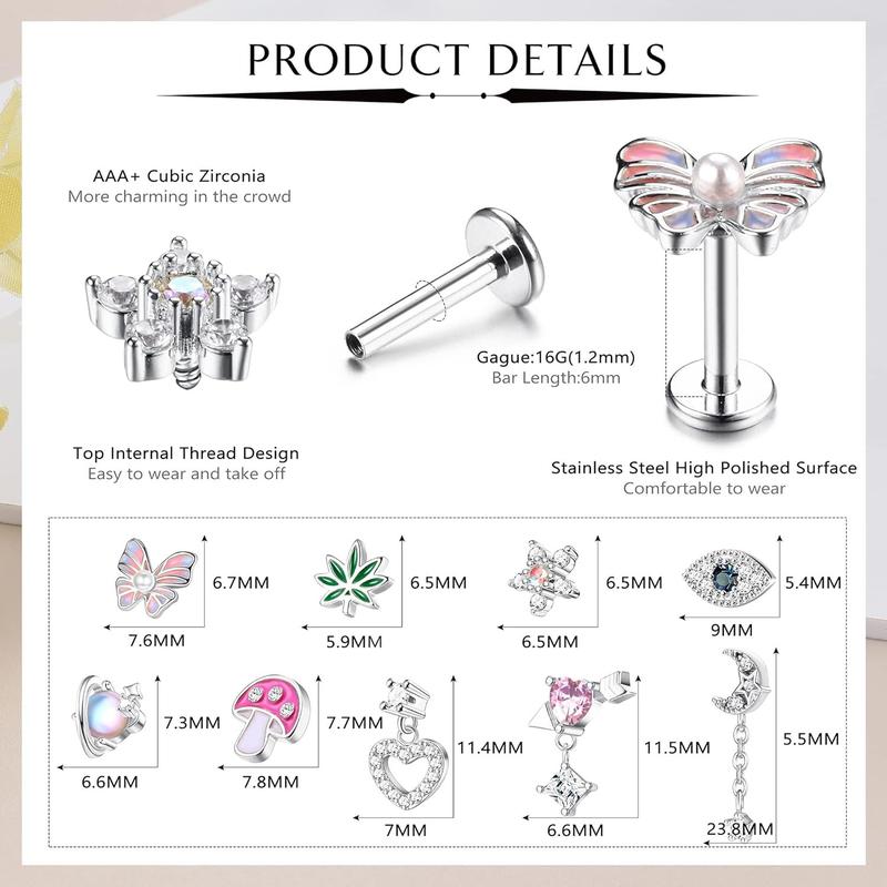 Tragus Piercing Jewelry: Discover our 9-piece tragus earrings for women, featuring flat backs and internally threaded screw tops. Adorned with charming shapes such as butterflies, flowers, hearts, evil eyes, moons, planets, and mushrooms, these tragus jewelry are perfect for adding a touch of personality to your daily style