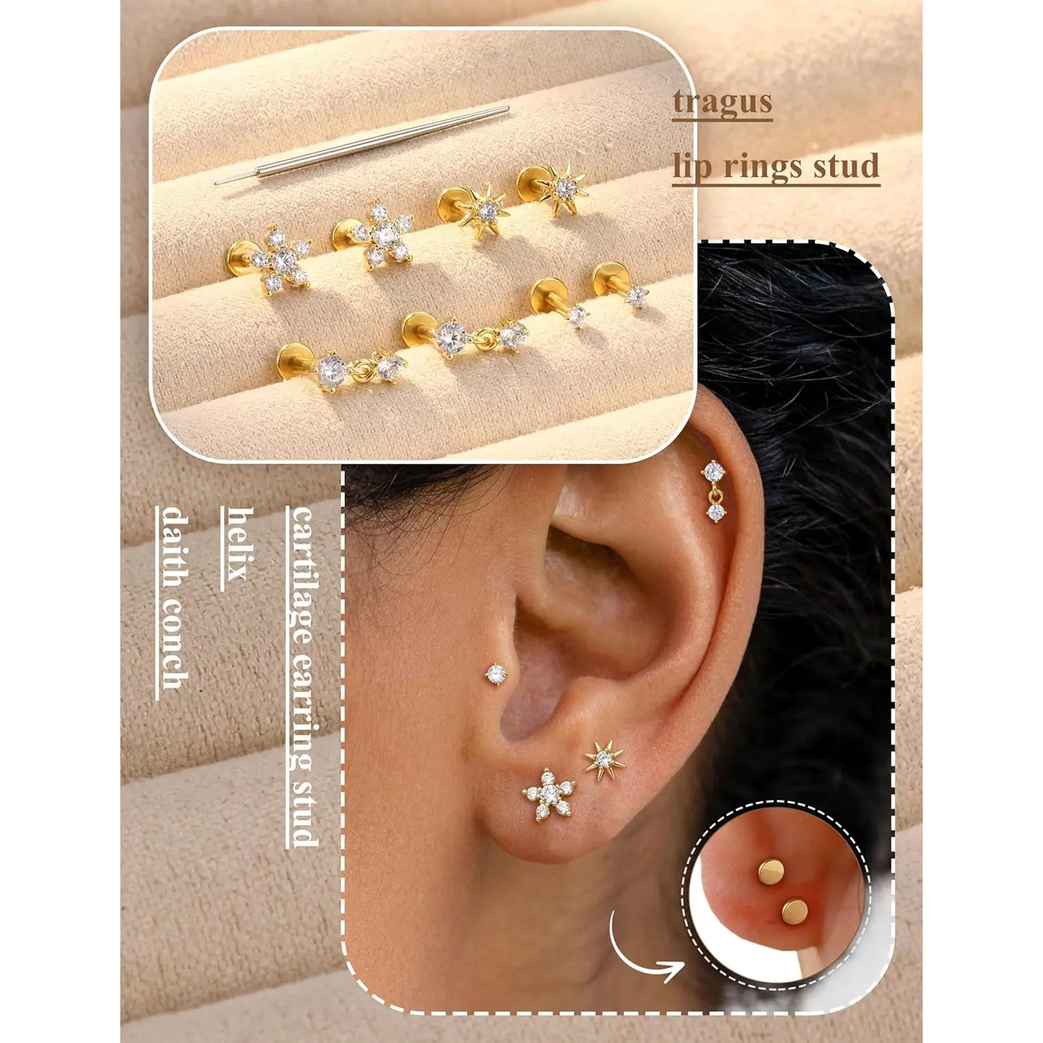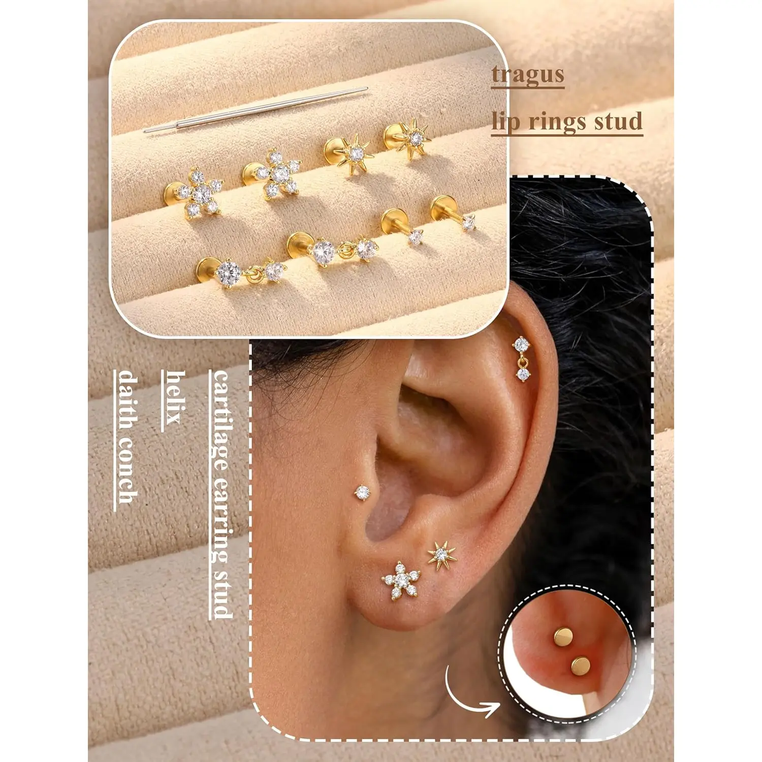 5. Sanfenly 9Pairs Threadless Flat Back Earrings Studs 316L Surgical Steel Push in Nose Studs Rings CZ Tragus Cartilage Helix Conch Labret Lip Nostril Medusa Piercing Jewelry Hypoallergenic 20G 18G 16G