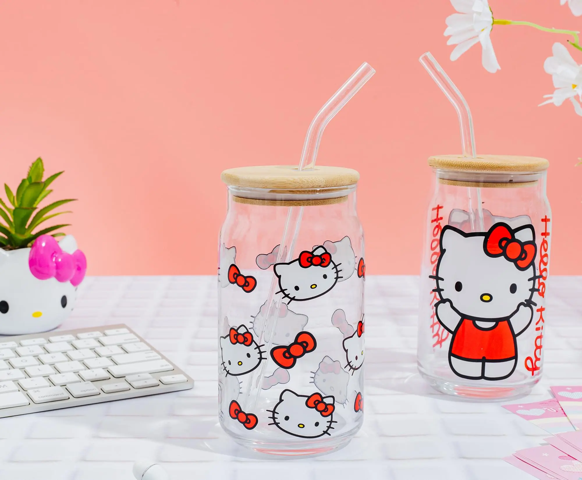 Sanrio Hello Kitty 16-Ounce Glass Tumblers With Bamboo Lid and Straw | Set of 2
