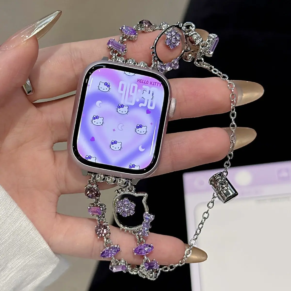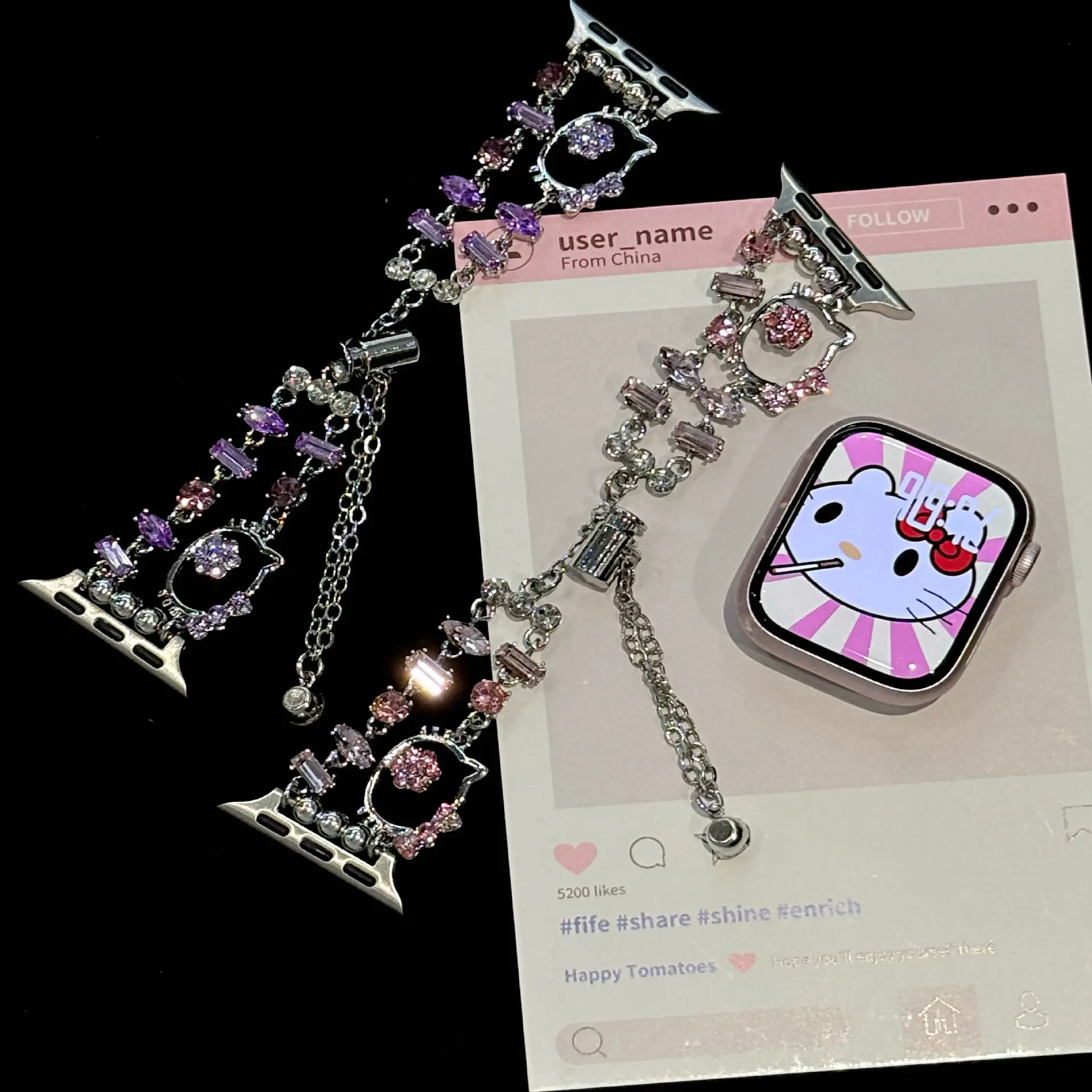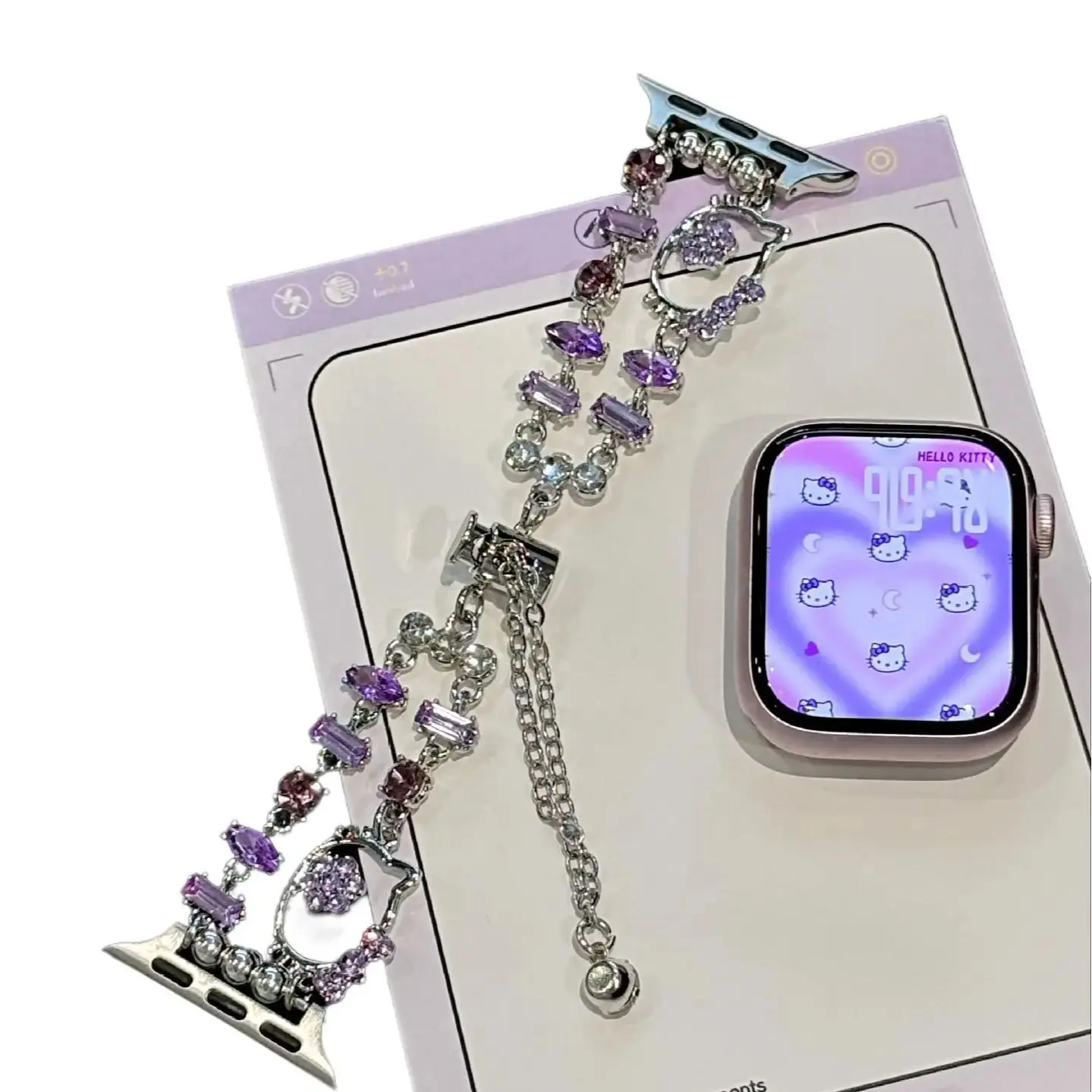 ✨ Charming Design: This strap features the beloved Sanrio Hello Kitty design. It's perfect for adding a cute touch to your accessories. The purple diamond chain enhances its stylish appeal. Ideal for those who love a blend of cuteness and style.