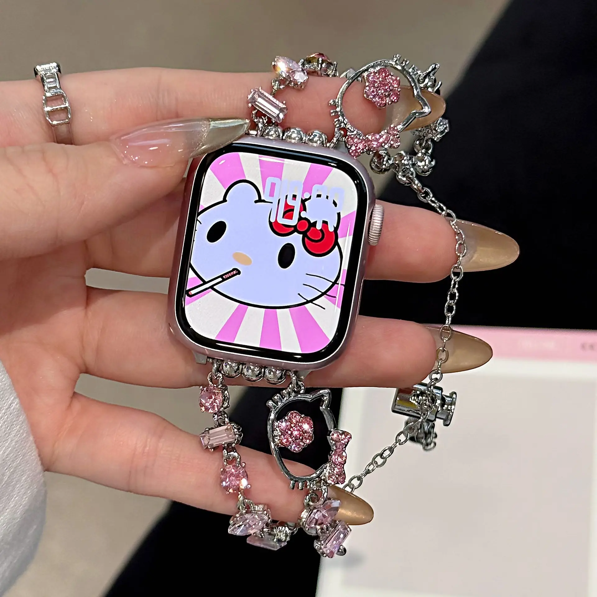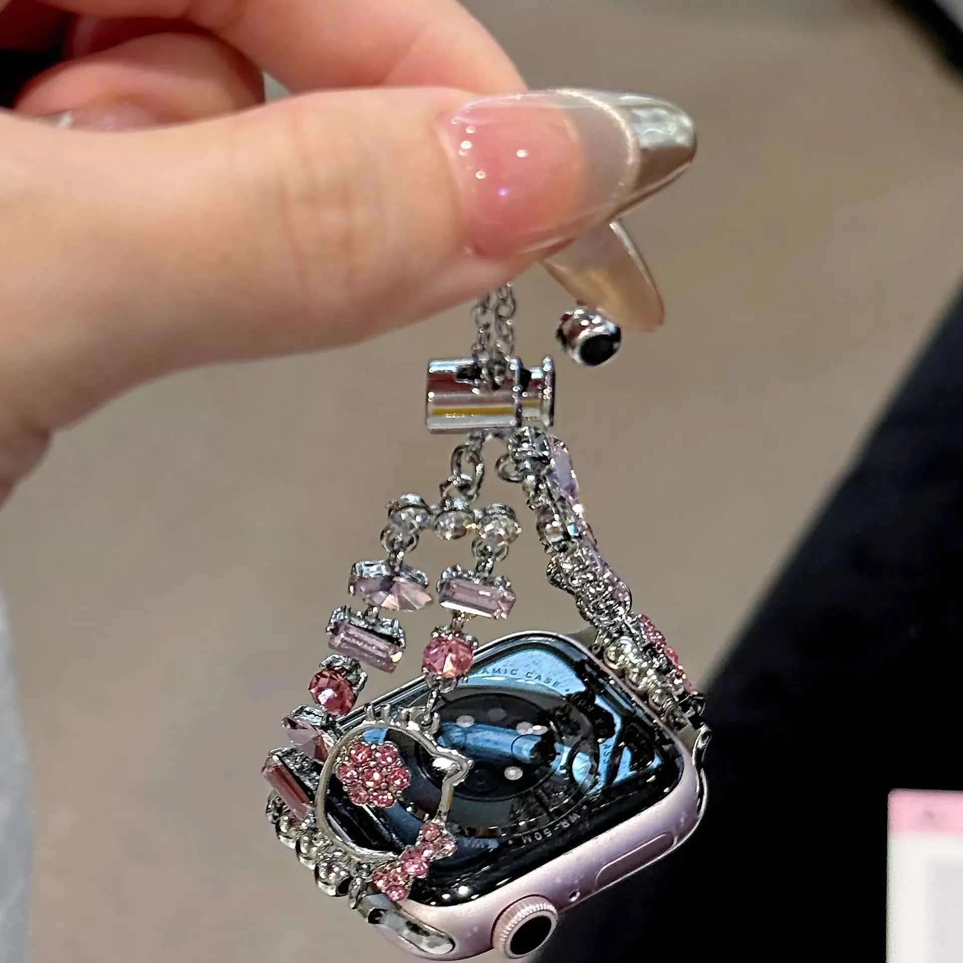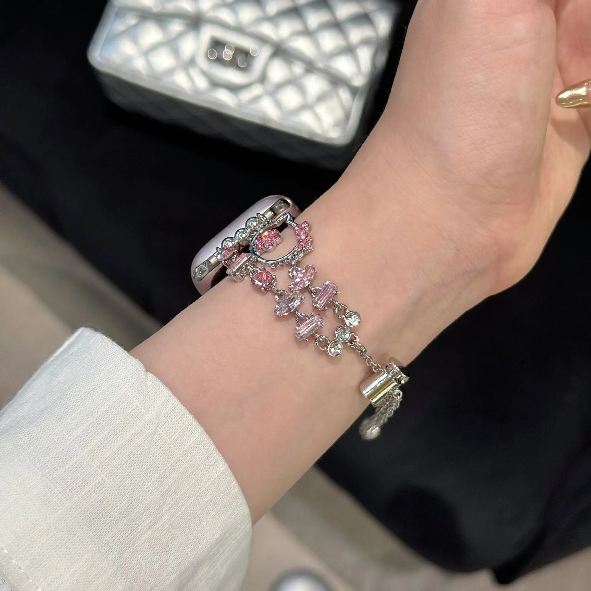✨ Charming Design: This strap features the beloved Sanrio Hello Kitty design. It's perfect for adding a cute touch to your accessories. The purple diamond chain enhances its stylish appeal. Ideal for those who love a blend of cuteness and style.