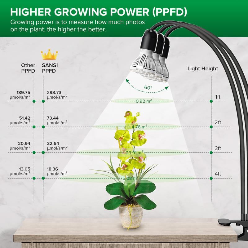 ·Higher Growing Power & Energy Saving: SANSI Grow lights offer high growing power of PPFD: 603 μmol/s/㎡@1ft, around 18 times higher than other brand. Through the lens for secondary scientific light distribution, improves light utilization, giving plants more supplementary light. Using only 30W of power, equivalent to 450W incandescent bulbs. Based on 18 hours per day usage, save up to 90% electricity, annual estimated cost 19.71