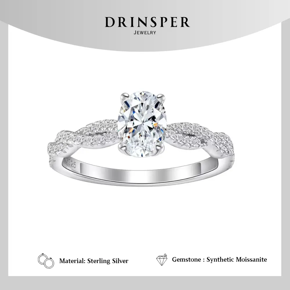 5. DRINSPER Twisted Oval S925 1.0ct Dvvs Synthetic Moissanite Sterling Silver Ring for Women Girls Suitable for Engagement Chrismas Gift for Girlfriend Jewelry Accessory