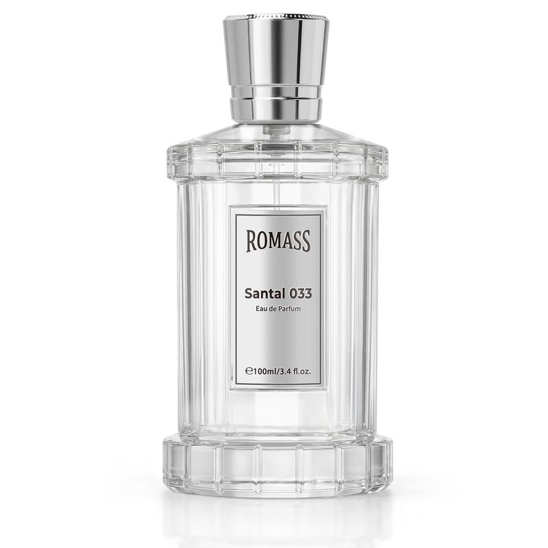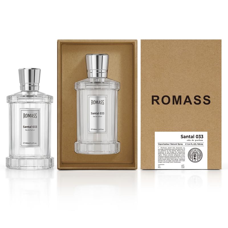 ROMASS Santal 033 is a unisex EDP parfum spray with a rich, layered aroma. It features top notes of cardamom, violet, and cedarwood. The fragrance opens with a fresh, spicy kick from cardamom, balanced by soft floral notes of violet and clean, crisp cedarwood.