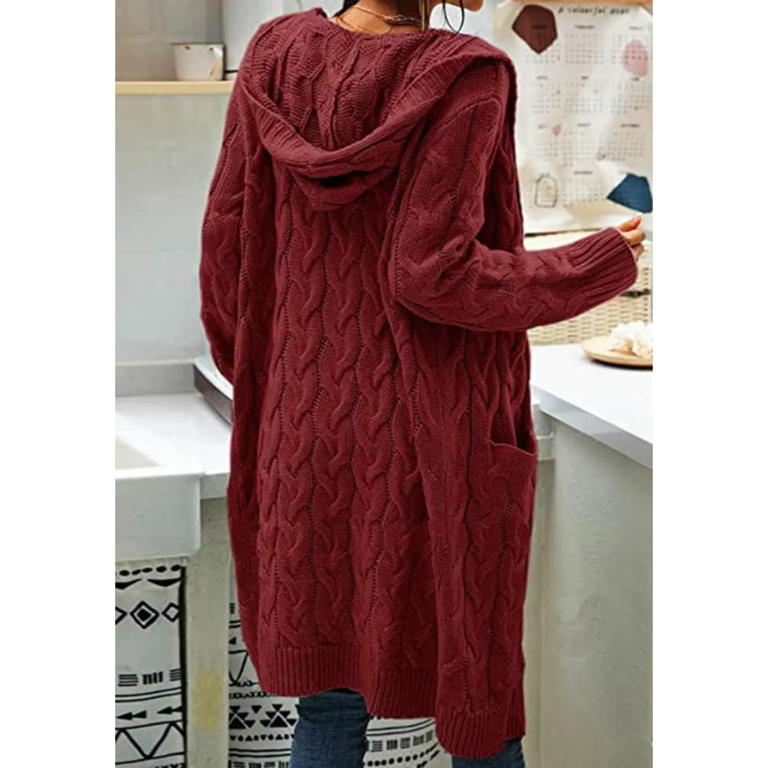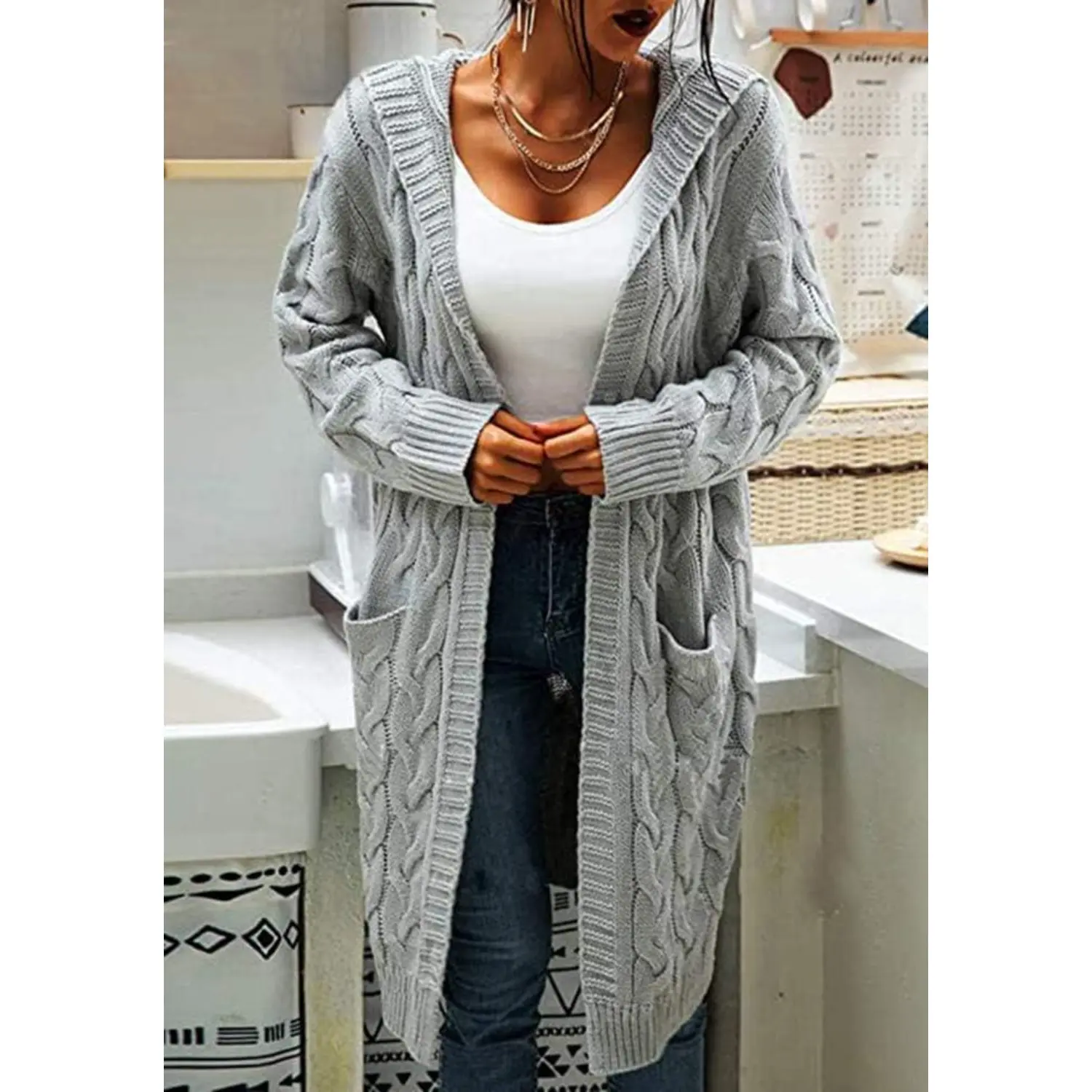 Saodimallsu Women Hooded Open Front Cardigan Cable Knit Sweaters Solid Color Chunky Long Sweater Coats