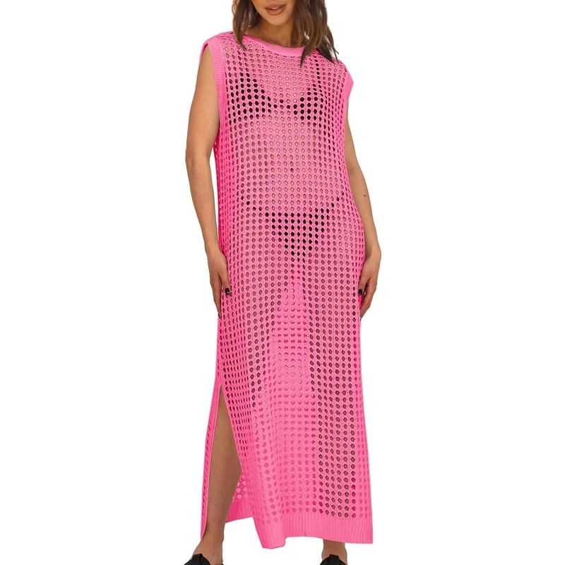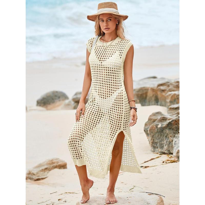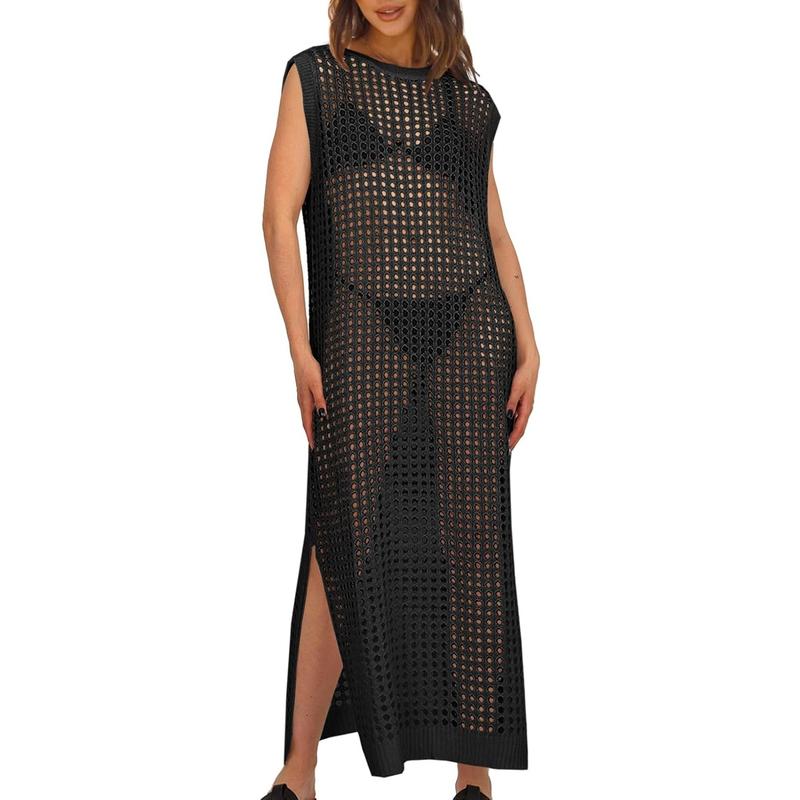 Saodimallsu Womens Crochet Swimsuit Coverup Summer Sleeveless Hollow Out Knit Crewneck Side Split Long Beach Dress