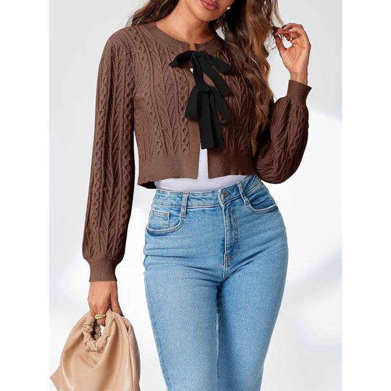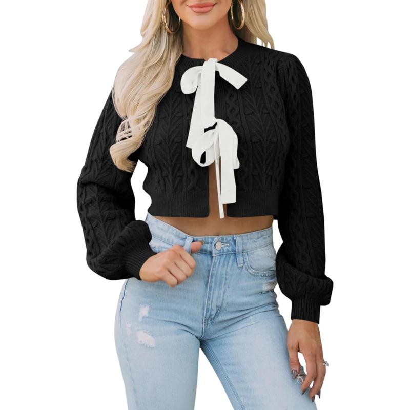 5. Saodimallsu Womens Cropped Cable Knit Cardigan Sweaters Long Sleeve Bow Tie Front Crew Neck Chunky Sweater Tops