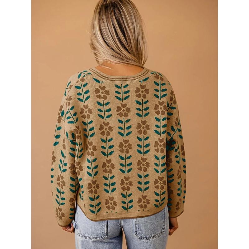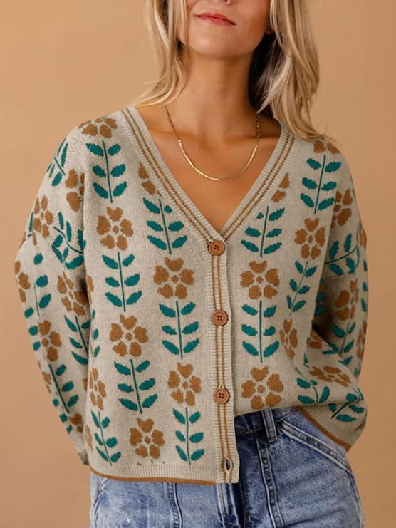 Saodimallsu Womens Floral Print V Neck Cardigan Open Front Button Down Knit Sweater Long Sleeve Loose Fashion TopsSaodimallsu Womens Floral Print V Neck Cardigan Open Front Button Down Knit Sweater Long Sleeve Loose Fashion Tops