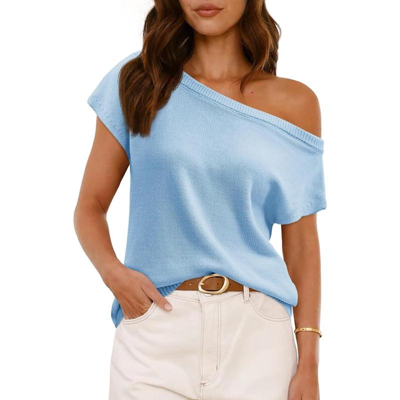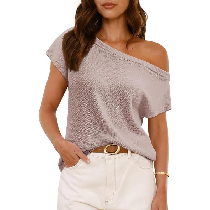 ✨ 2026 Trendy Off Shoulder Short Sleeve Sweater Tops. This chic one shoulder knit top adds a trendy style to your daily outfits. Perfect for spring and summer, it's soft and lightweight. 🌞