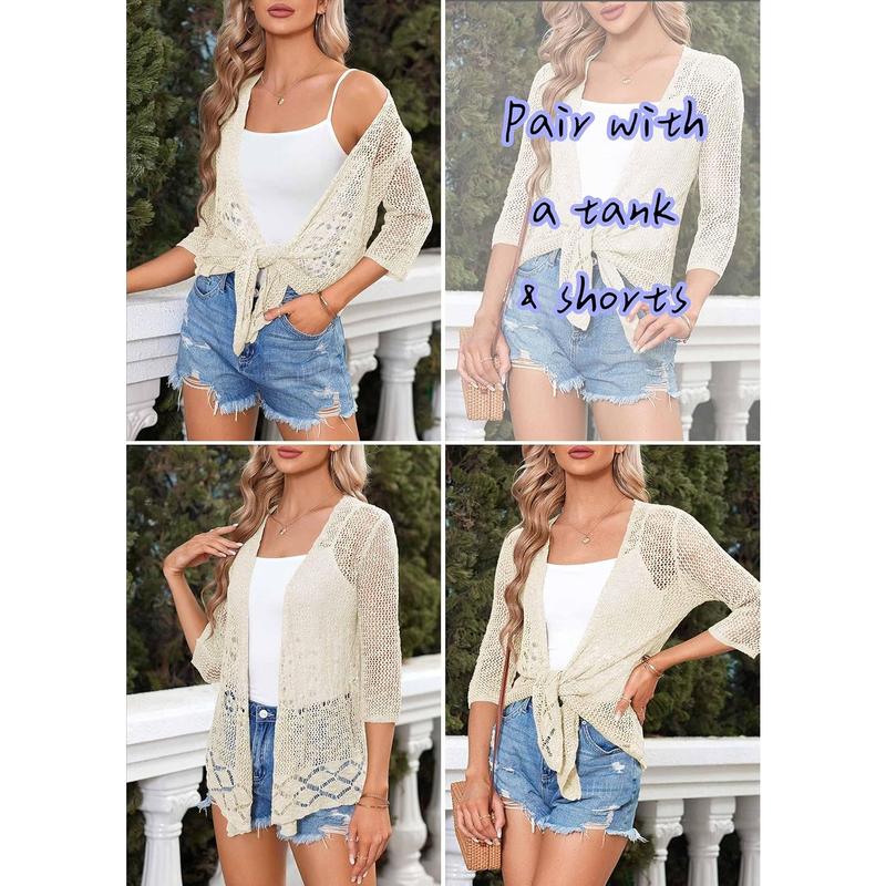 5. Saodimallsu Womens Sheer Shrug Sweaters 3/4 Sleeve Open Front Tie Cardigan Bolero Jacket Lightweight Crochet Knit Cover Up Tops