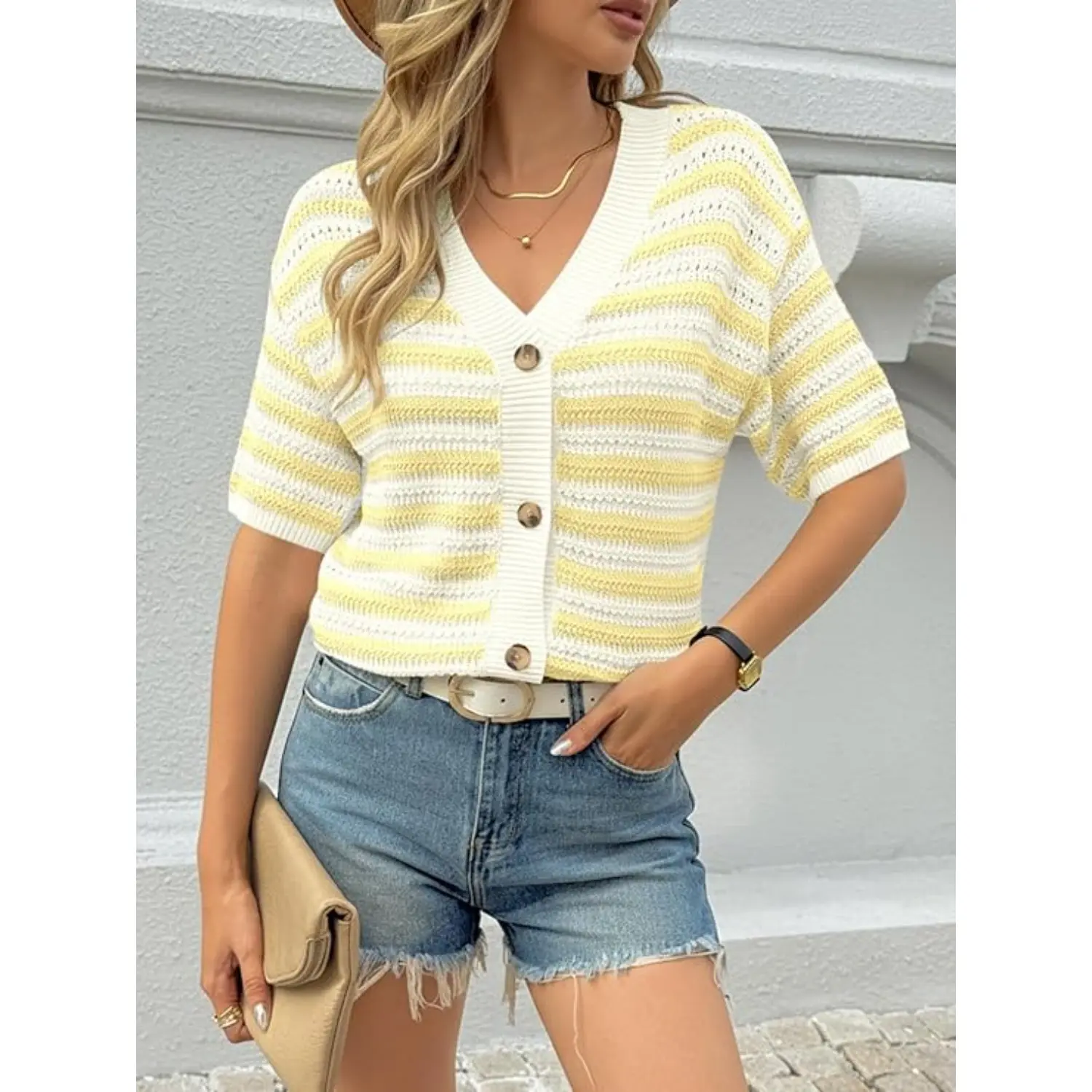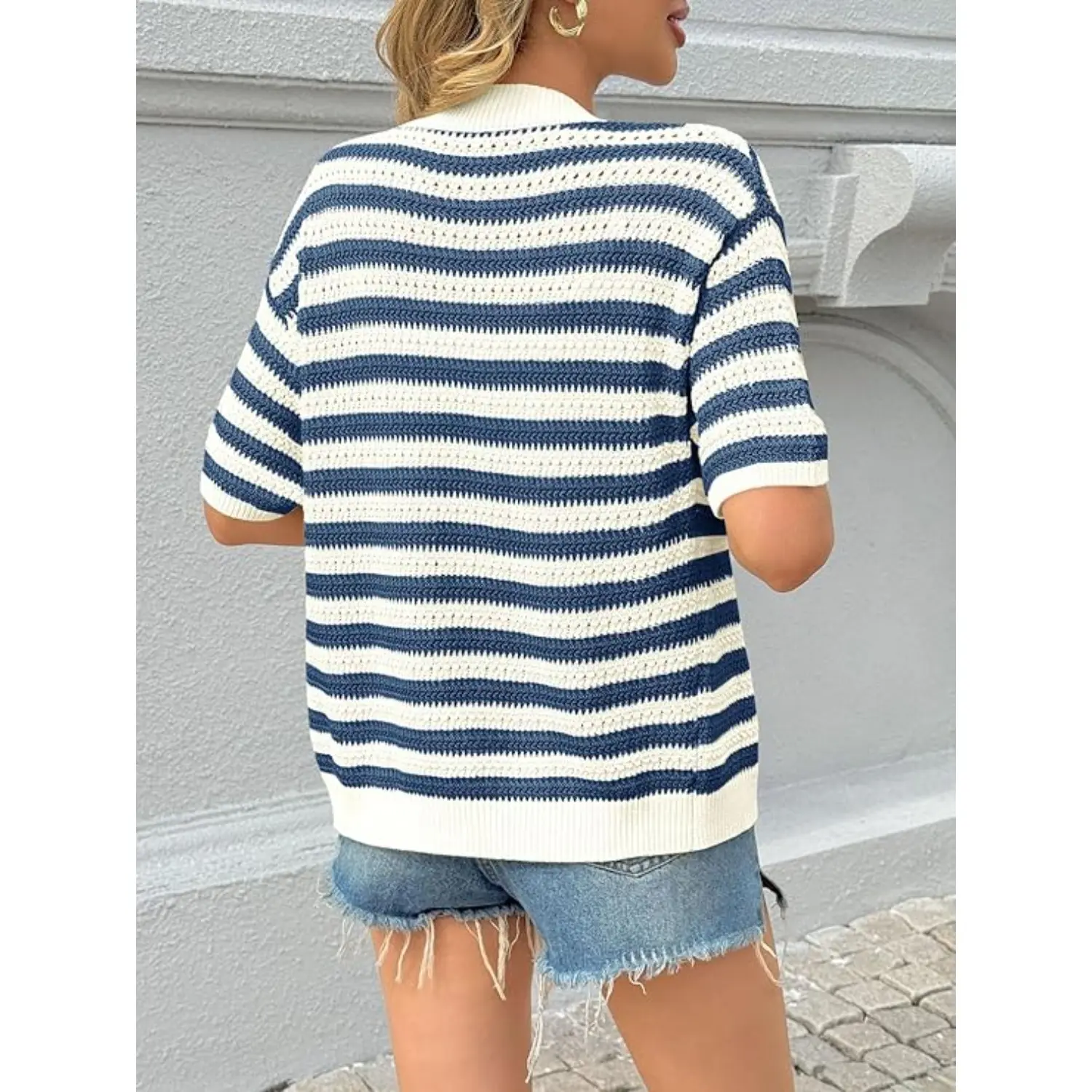 5. Saodimallsu Womens Short Sleeve Striped Cardigan Sweaters Crochet Knit Button Down Shirts V Neck Spring Summer Tops