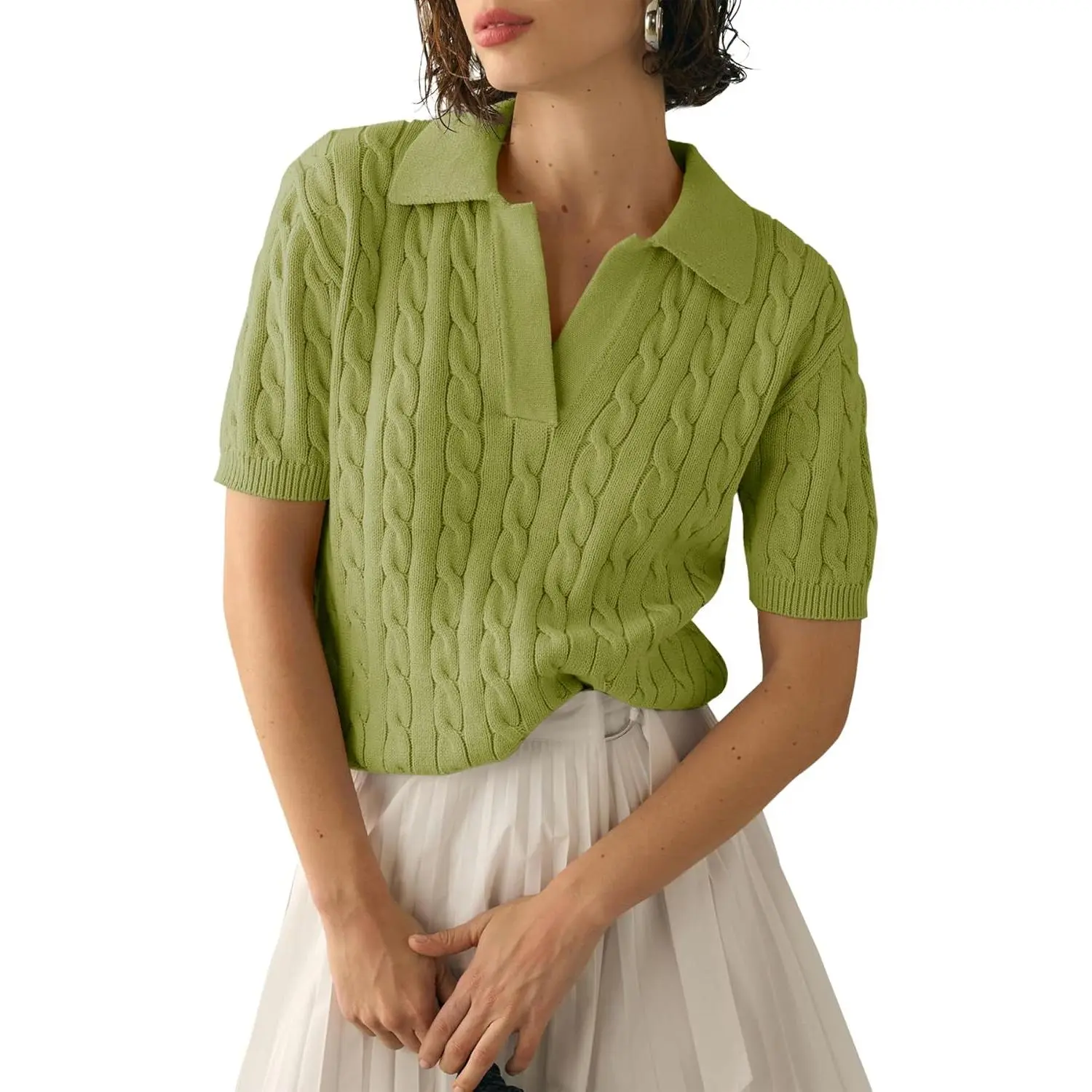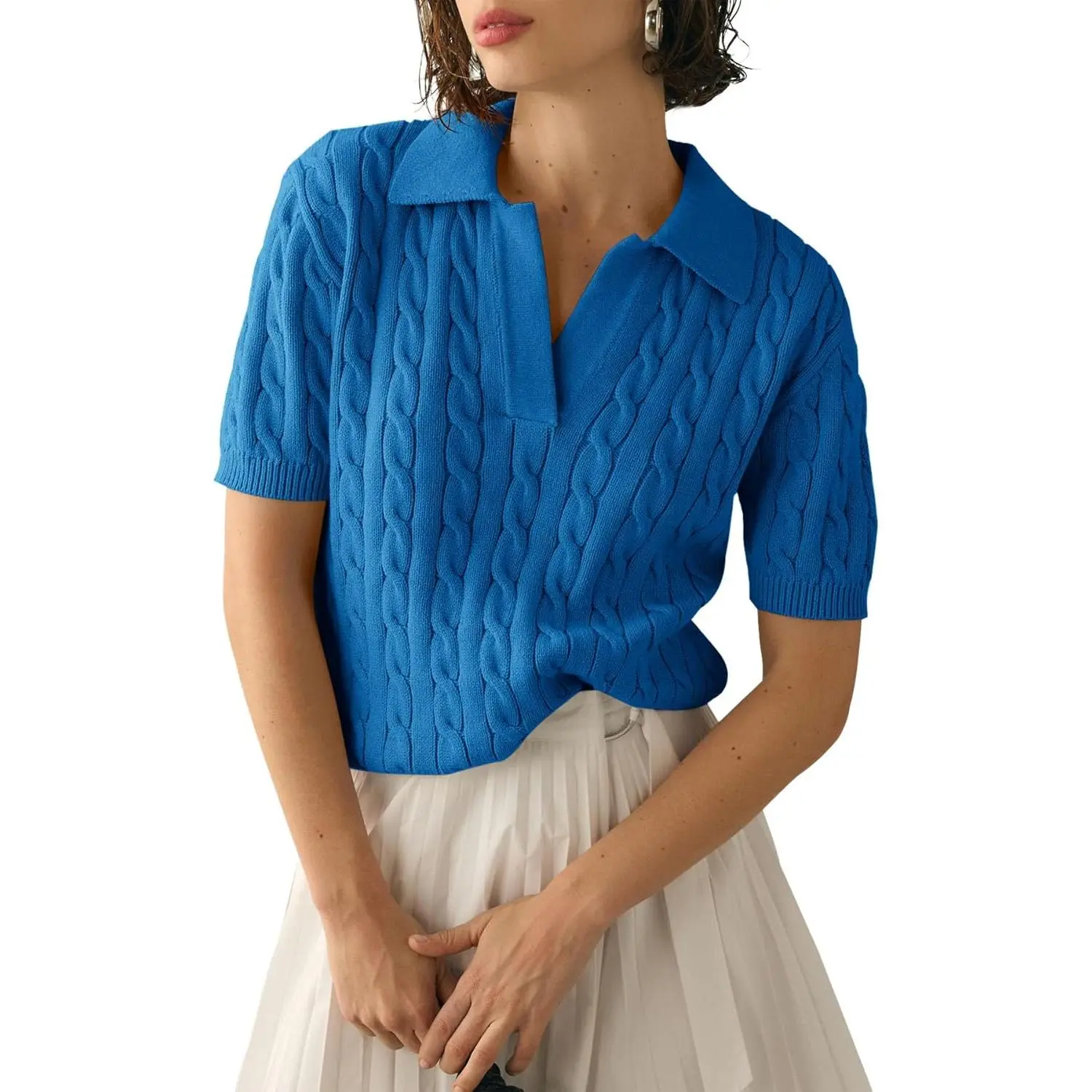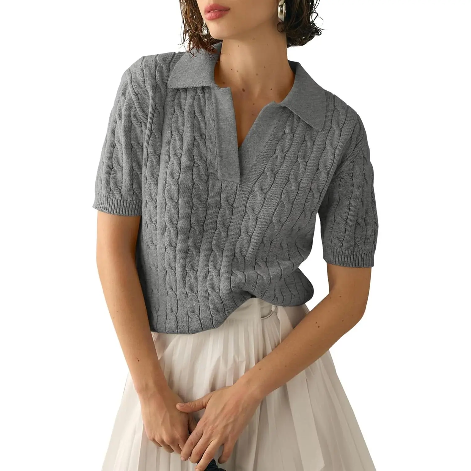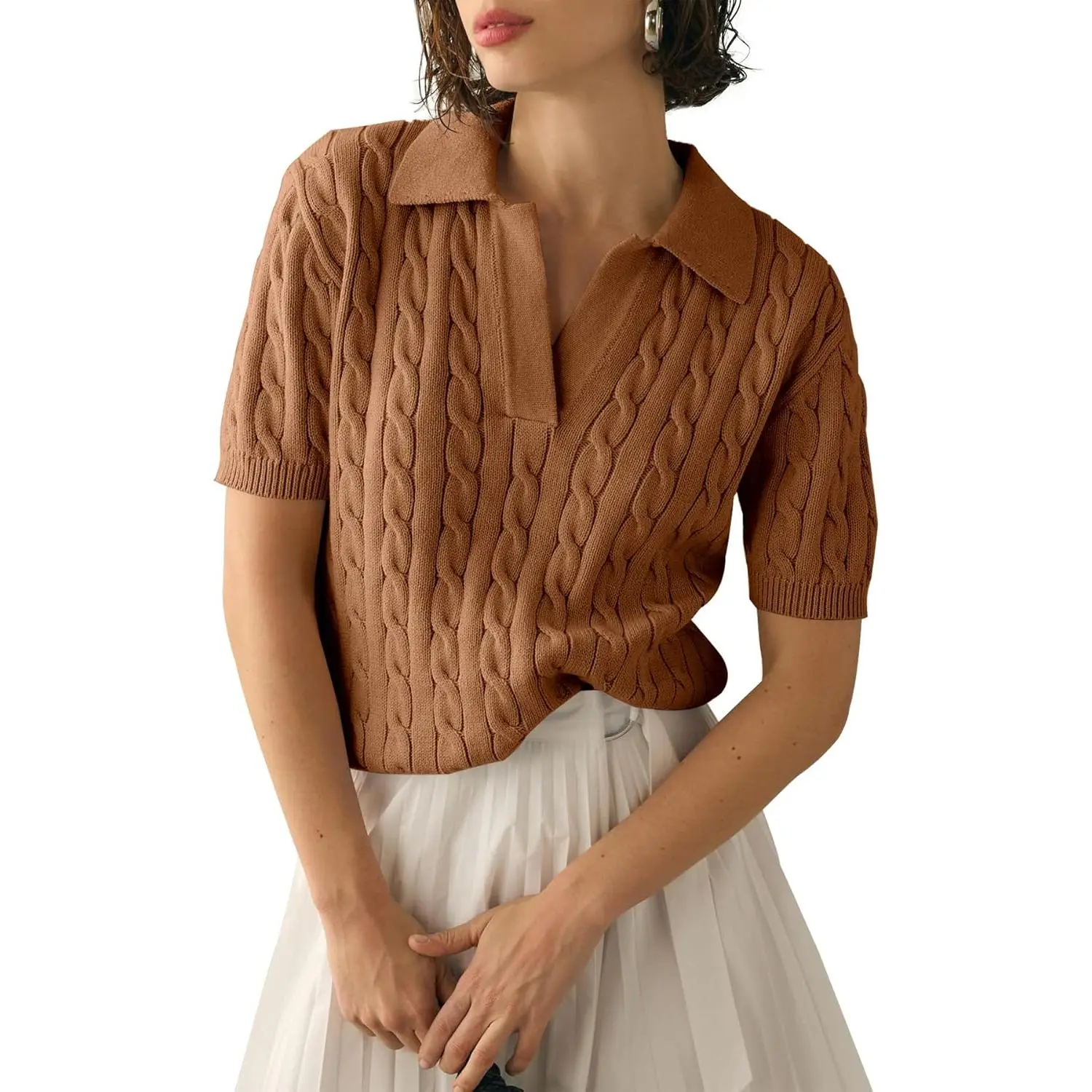 5. Saodimallsu Women's Cable Short Sleeve Sweaters Tops Solid Lapel V Neck Knit Casual Soft Pullover Shirt