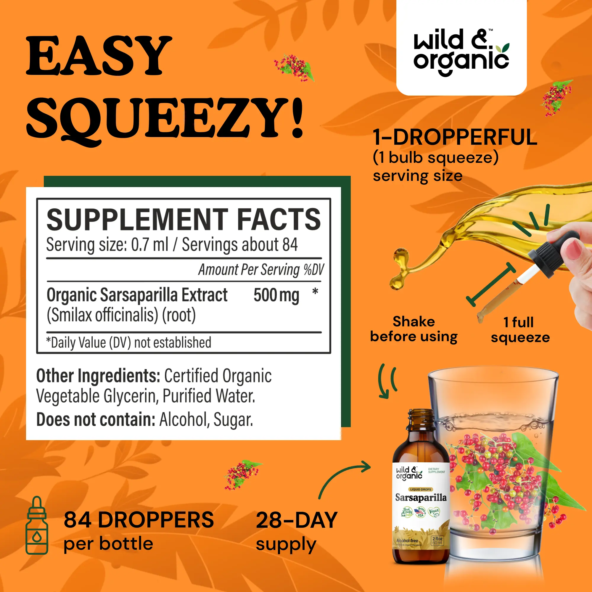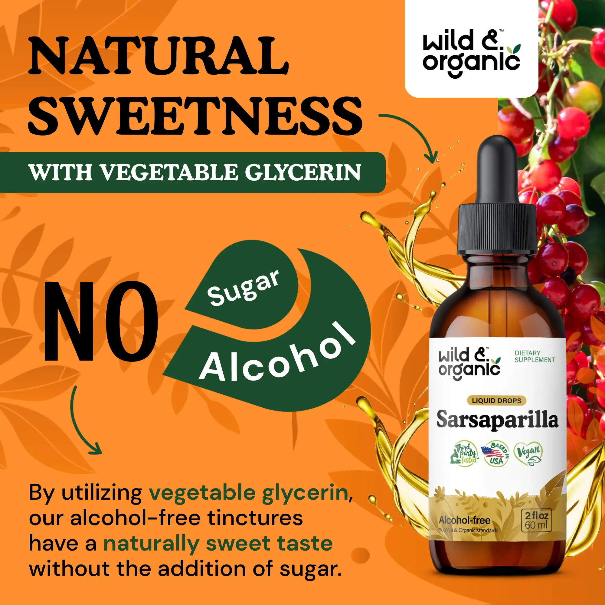 Alcohol-Free: Wild & Organic's sarsaparilla liquid drops are vegetable glycerin-based. This provides an alcohol-free tincture that is gentle on digestion. Enjoy a supplement without the digestive.