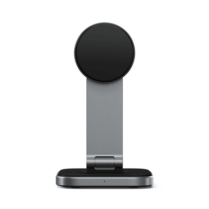 Ever struggled with messy cables or juggling multiple chargers? The Satechi 2-in-1 Foldable Qi2 Wireless Charging Stand is here to simplify your charging routine. Designed to power your iPhone and AirPods simultaneously, it delivers 15W and 5W respectively, so you can keep your essentials ready to go without the clutter. Its foldable design means you can easily pack it for travel or tuck it away on your desk. Crafted with premium-grade aluminum and a vegan leather base, it’s as stylish as it is sturdy. The soft silicone charging puck keeps your devices safe from scratches while charging. Plus, you can prop your phone up in portrait or landscape mode, perfect for catching up on videos or video calls hands-free. Included in the box is the charging stand itself—ready to plug in and power up your devices. Ready to ditch the cables and keep your tech organized? Grab the Satechi wireless charging stand and enjoy hassle-free charging every day.